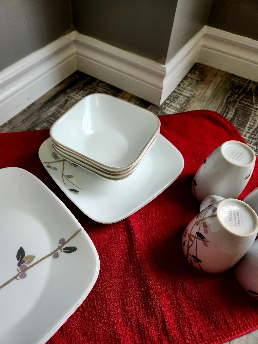 Selling a set of Corelle square dishes! Includes plates, bowls, and mugs with a lovely floral design. Great for everyday use or special occasions. They're in excellent condition and ready for a new home!