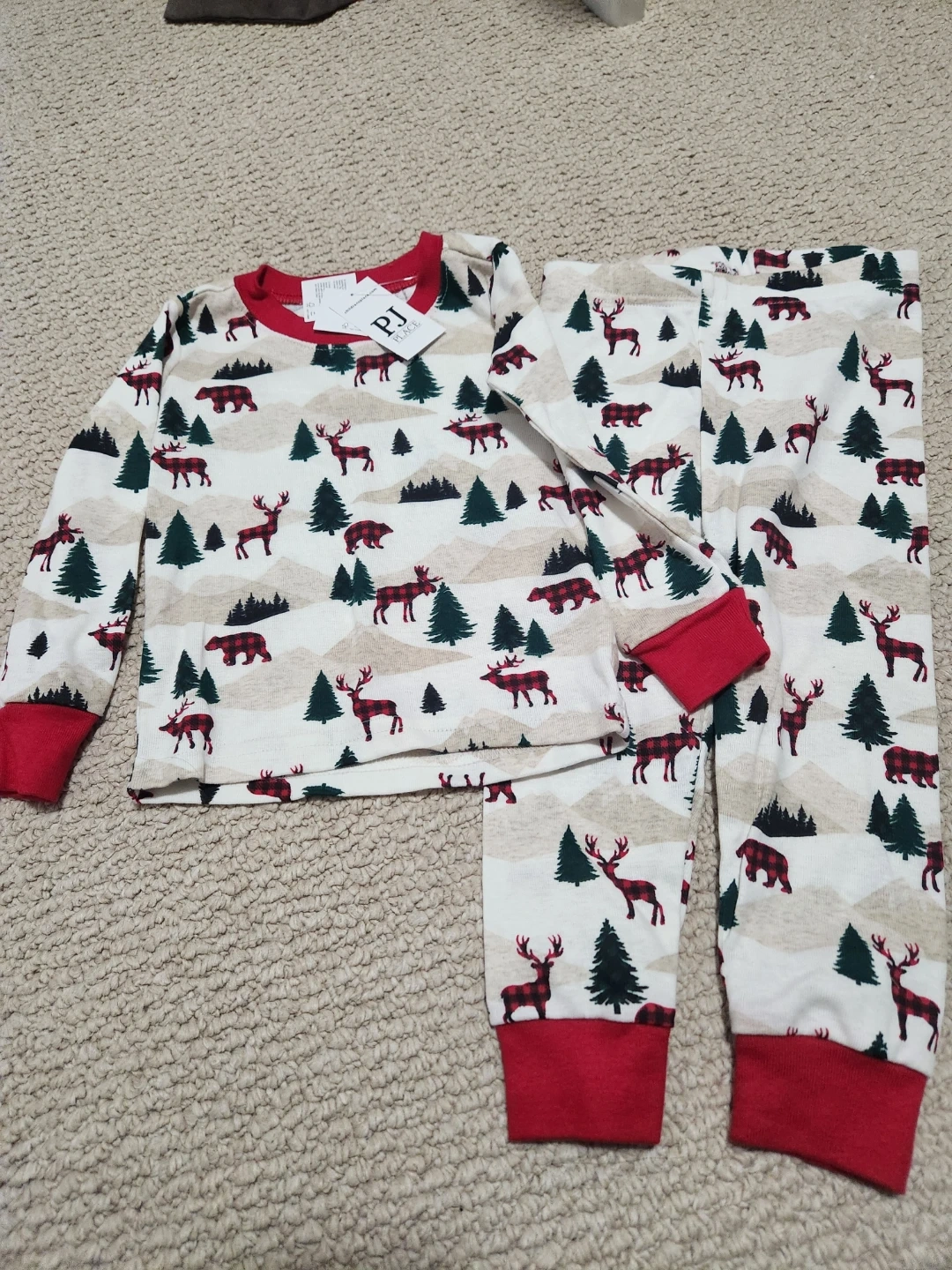 Adorable PJ Place pajama set for kids! The set features a cute pattern with reindeer, bears, and evergreen trees. The cuffs and neckline are a festive red colour. Perfect for the holiday season or any cozy night in!