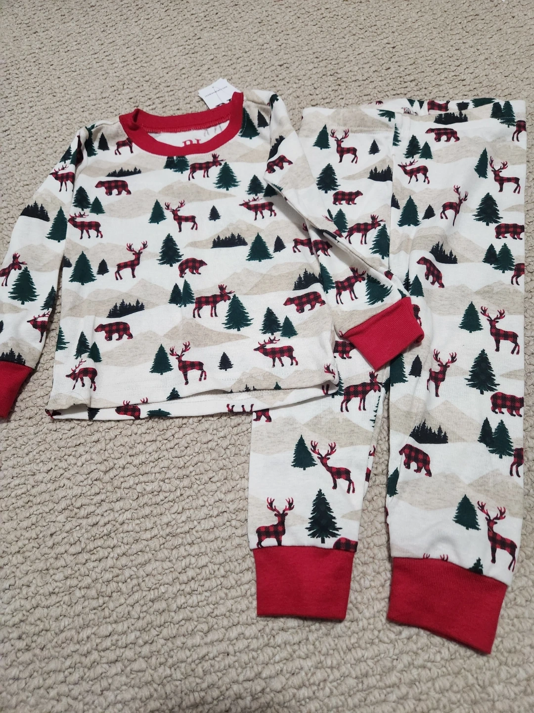 Adorable PJ Place pajama set for kids! The set features a cute pattern with reindeer, bears, and evergreen trees. The cuffs and neckline are a festive red colour. Perfect for the holiday season or any cozy night in!