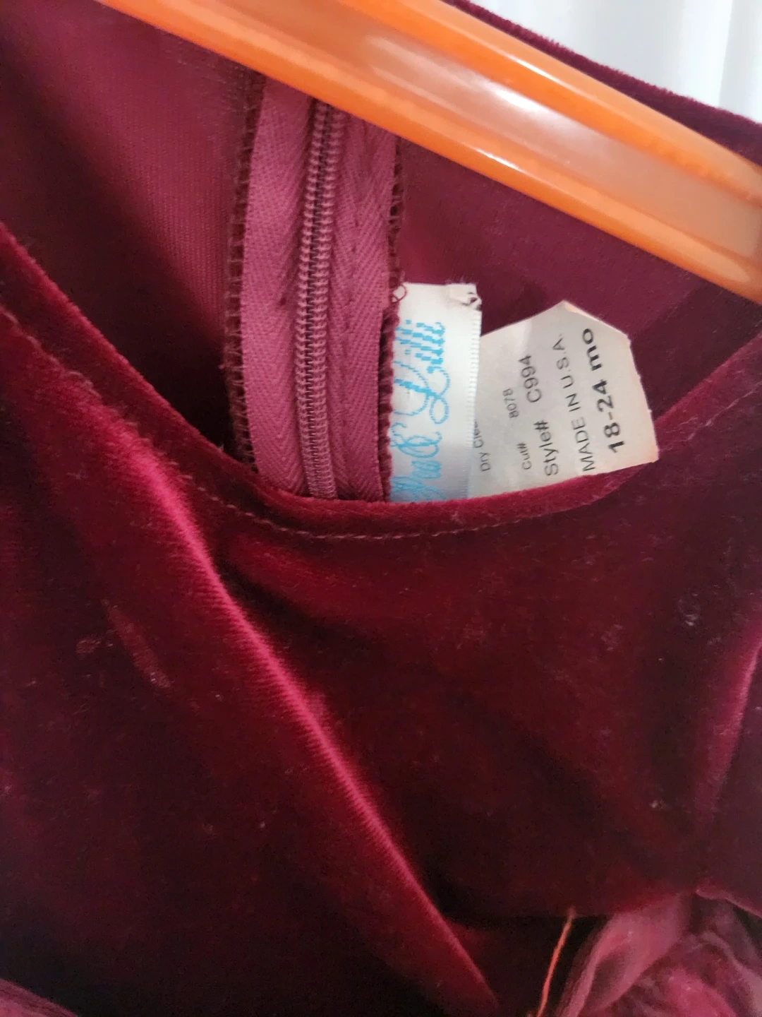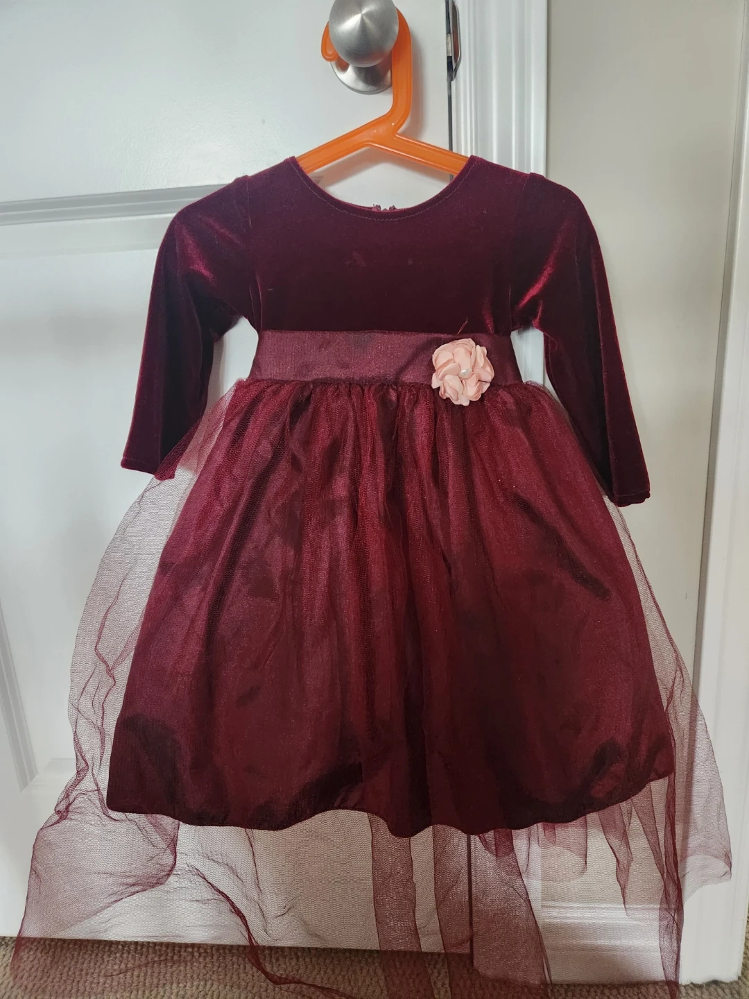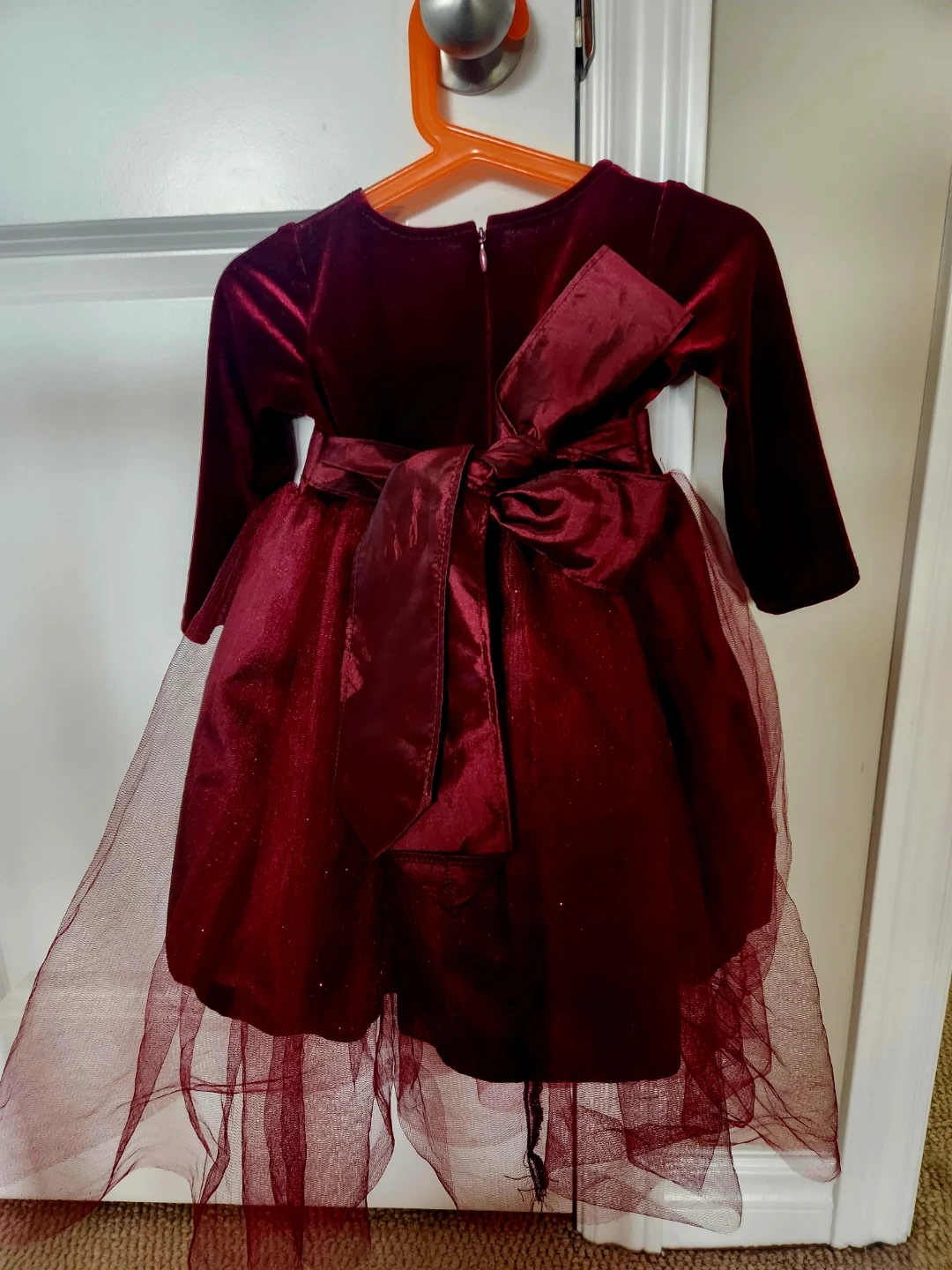 A beautiful burgundy dress from Holly Lilli, perfect for a special occasion! The dress is sized for 18-24 months and features a velvet bodice, a tulle skirt, and a satin ribbon. The dress also has a lovely flower detail at the waist and a bow in the back
