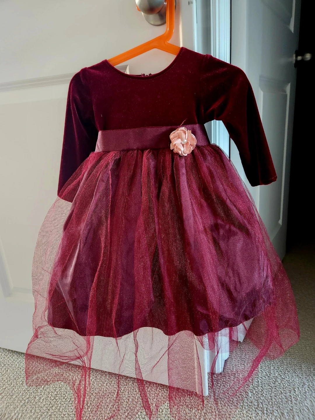 A beautiful burgundy dress from Holly Lilli, perfect for a special occasion! The dress is sized for 18-24 months and features a velvet bodice, a tulle skirt, and a satin ribbon. The dress also has a lovely flower detail at the waist and a bow in the back
