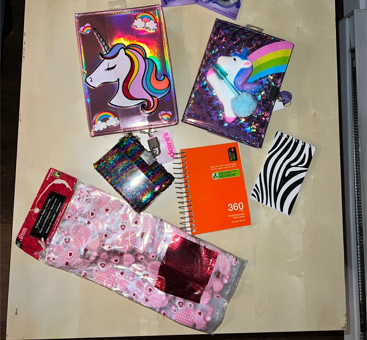 I was organizing my stuff and these 3 notebooks are new I never use them. Prices for them originally 25$, 12$ and 21$. super cute, it’s from Clair’s.