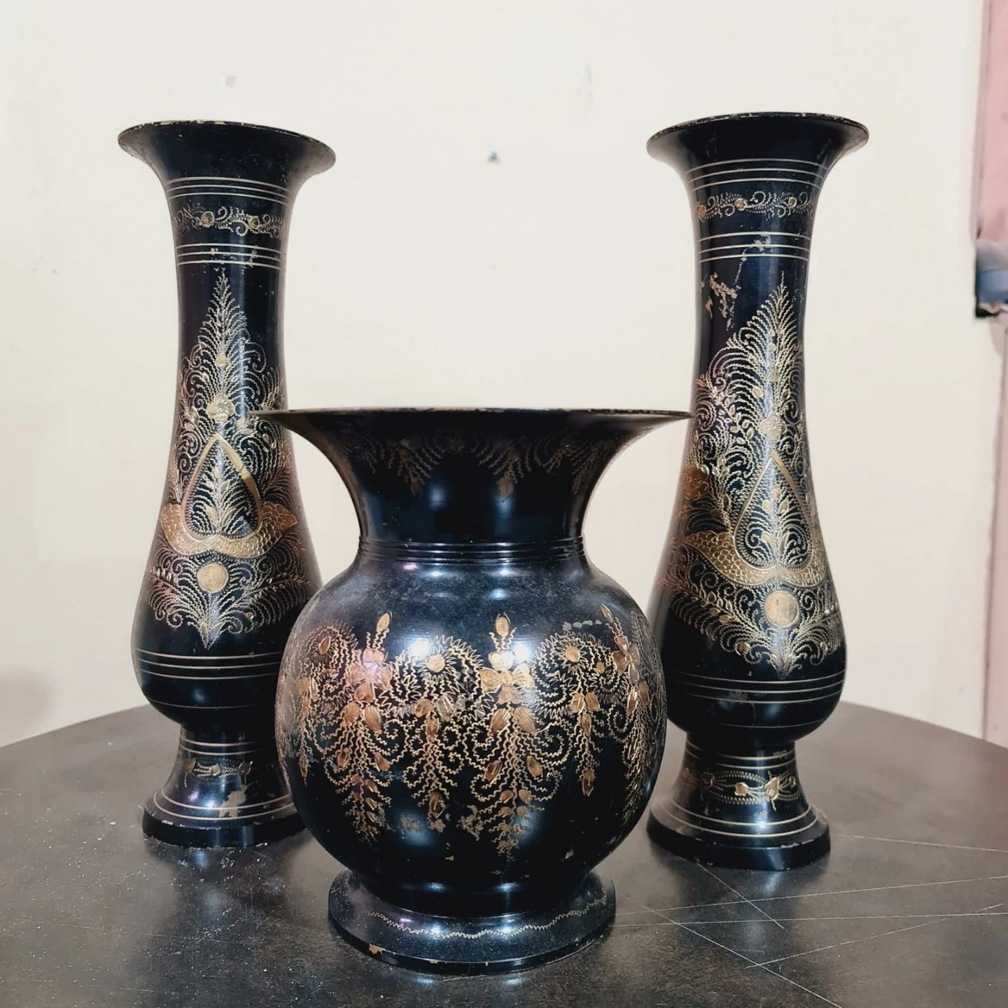Here's a set of three decorative vases! They're black with gold detailing and would look lovely on a shelf or mantle. The set includes two tall vases and one shorter, rounder vase. A perfect gift as well - feel free to stop by in-person to see this piece!