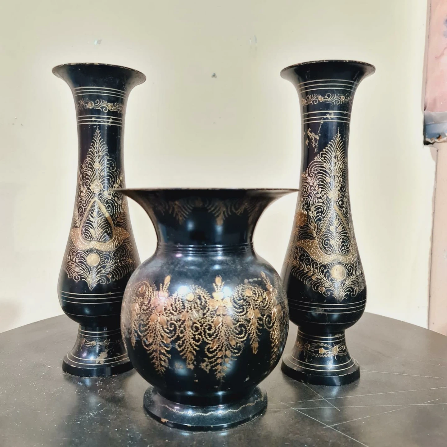 Here's a set of three decorative vases! They're black with gold detailing and would look lovely on a shelf or mantle. The set includes two tall vases and one shorter, rounder vase. A perfect gift as well - feel free to stop by in-person to see this piece!