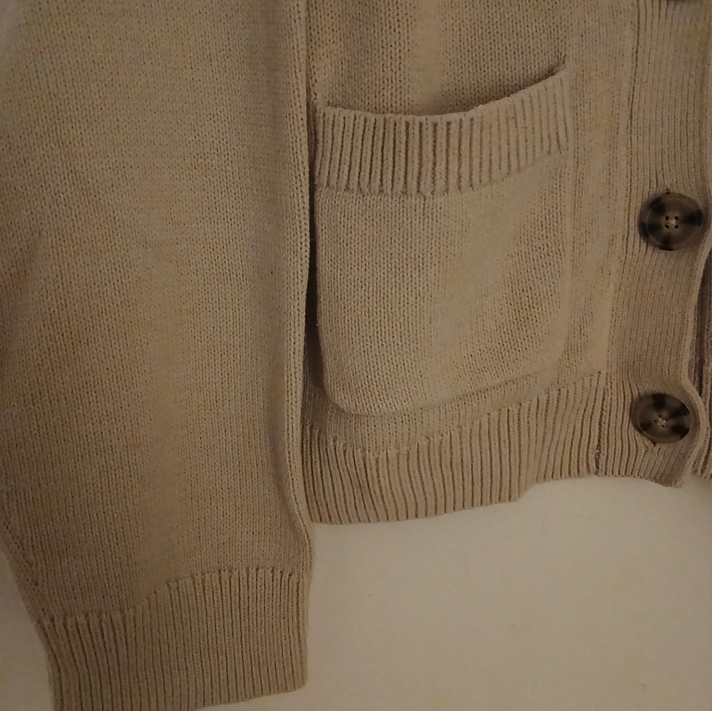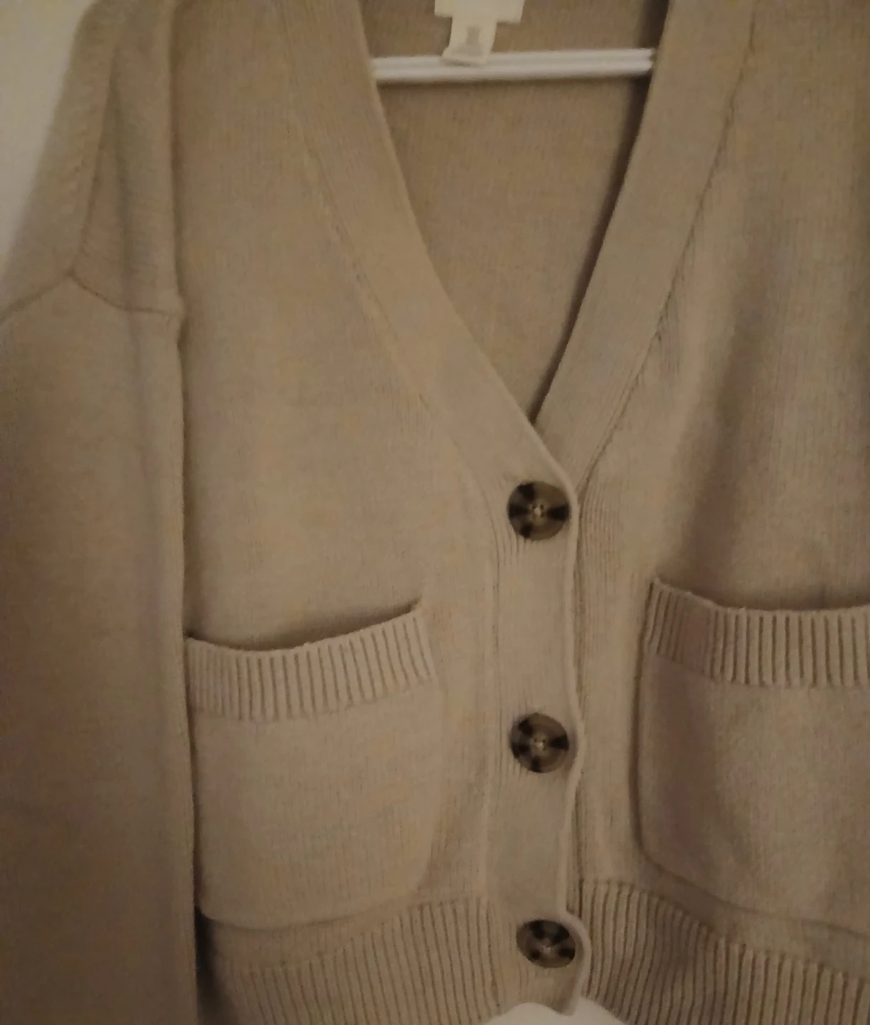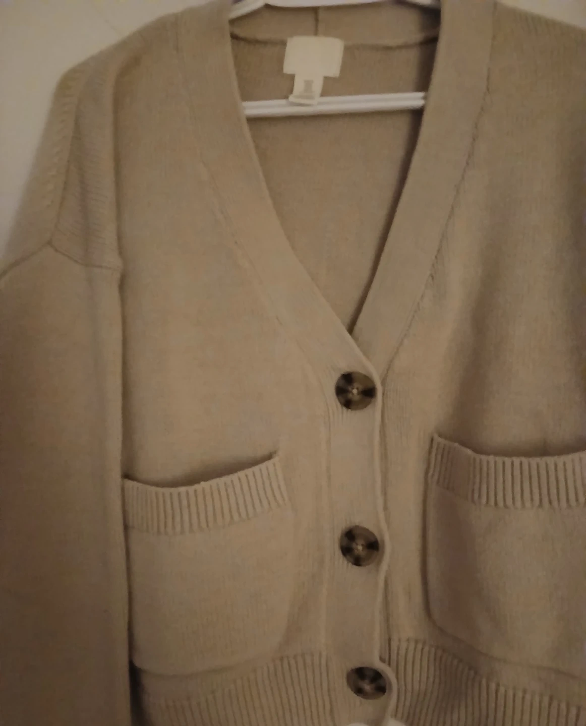 Selling a cozy beige cardigan from H&M in size M! It's in great condition and features a classic button-down design with cute pockets. Perfect for layering on chilly days!