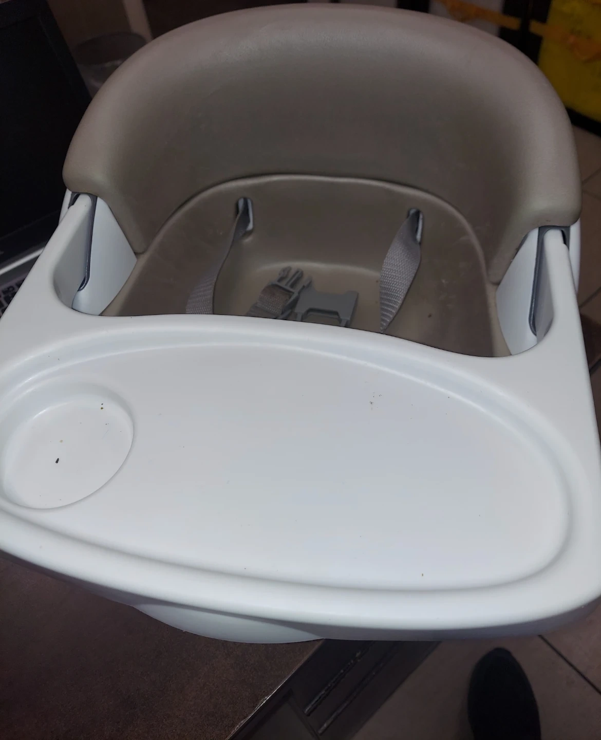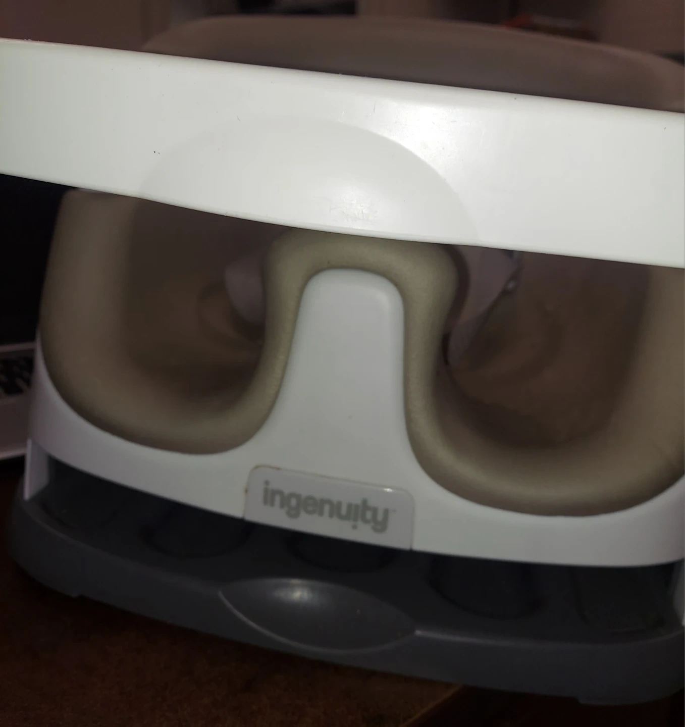 Selling an Ingenuity Baby Base 2-in-1 Booster Feeding and Floor Seat with Self-Storing Tray in Slate color. This seat is perfect for feeding time and allows your little one to sit comfortably on the floor or attached to a chair. It shows some signs of use but is still in good working condition and ready for a new family!