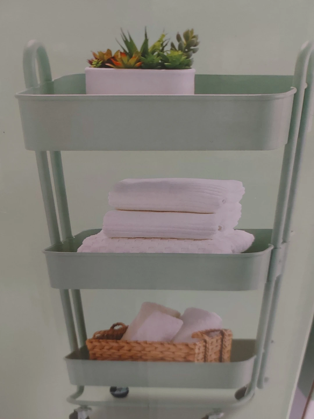 Selling a Type A 3-Tier Utility Cart in a lovely mint colour. It's perfect for adding some extra storage to any room in your home. Easy to assemble and move around thanks to its smooth-rolling casters. The box is included!