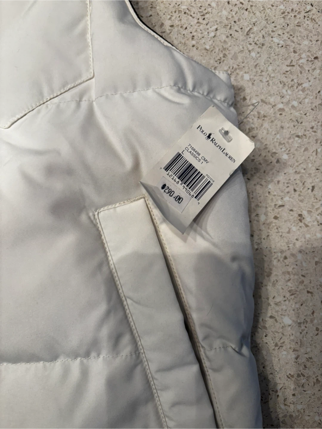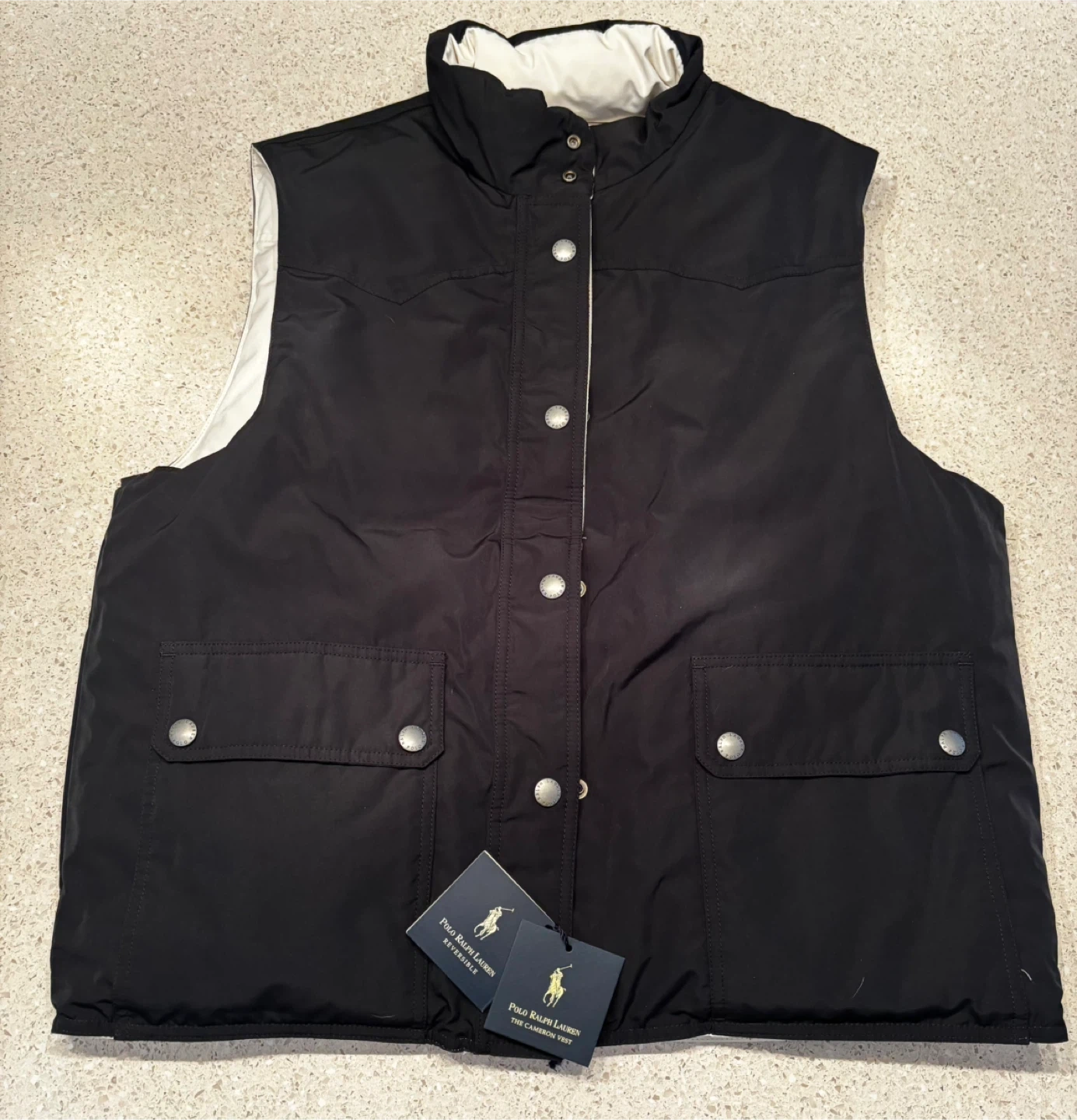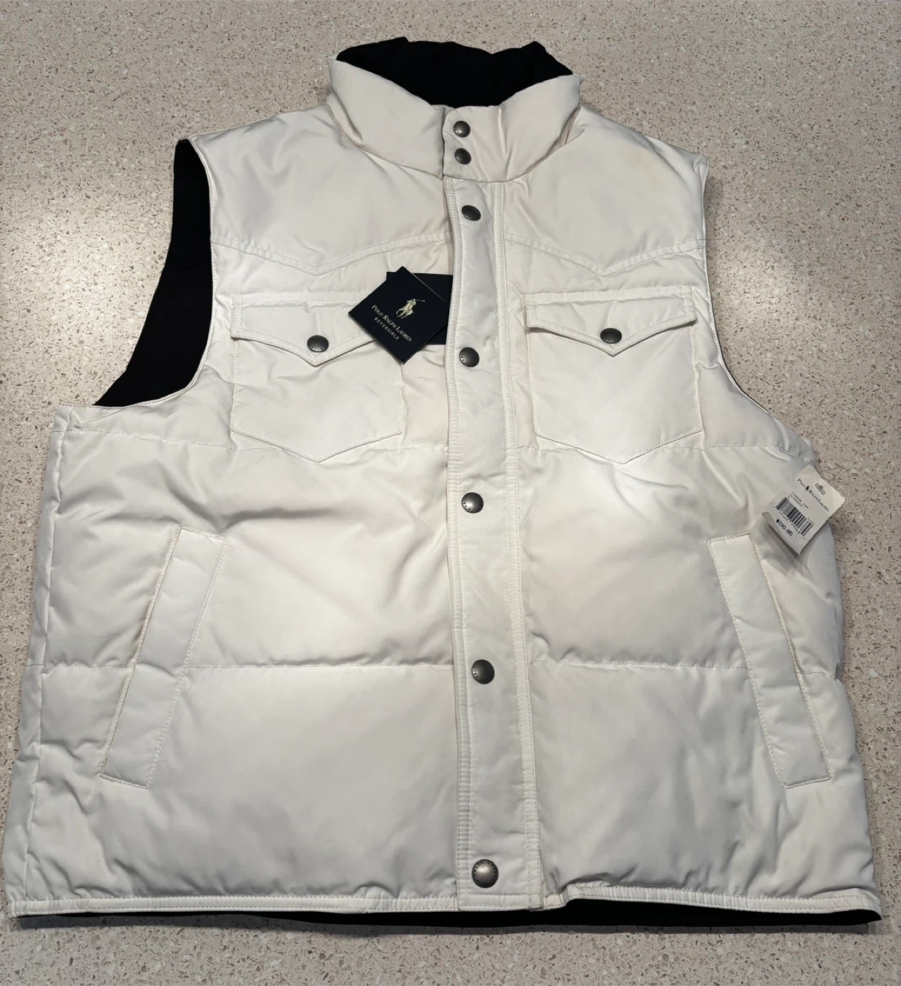 This is a Polo Ralph Lauren Classics Vest in white. It is reversible with black on the inside. The original price was $290.00. $100 cash. Porch pick up Kennedy and eglinton.