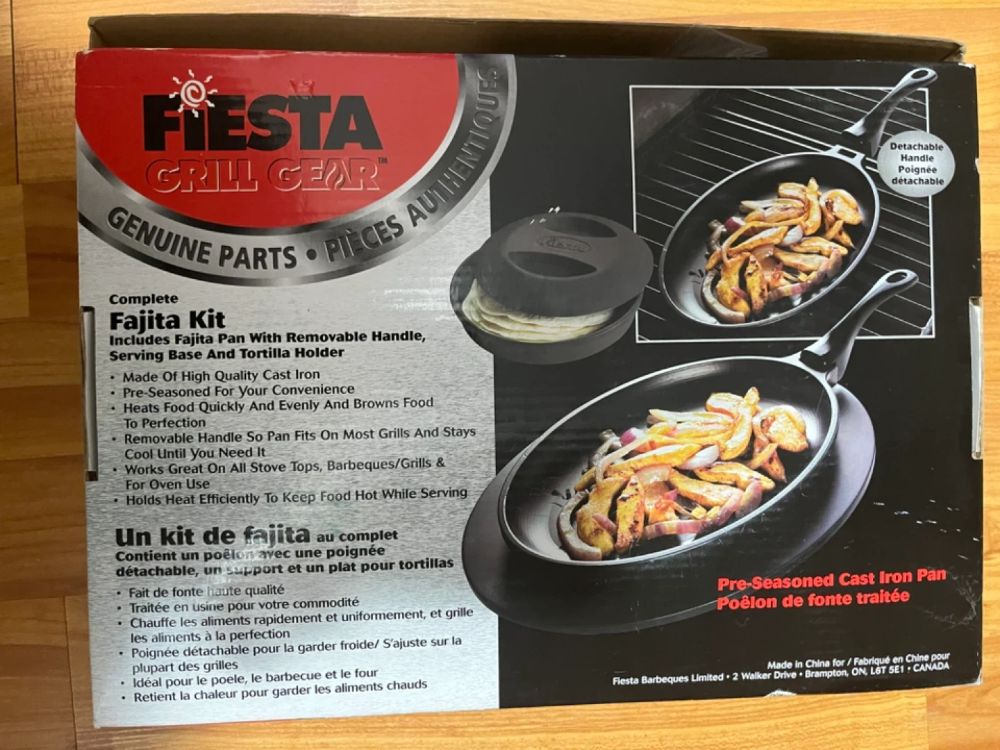 Great Christmas gift. Selling a complete Fiesta Grill Gear Fajita Kit! This set includes a fajita pan with a removable handle, serving base, and tortilla holder. The pan is made of high-quality cast iron and is pre-seasoned for your convenience. It heats food quickly and evenly, perfect for stove tops, barbeques, grills, and even oven use! The removable handle ensures the pan fits on most grills and stays cool when you need it