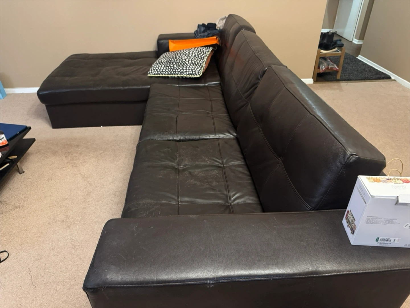 This is a genuine Italian leather sectional sofa, perfect for a living room or entertainment area. This sofa has seen better days, which is reflected in the price. It says signs of wear and tears. However it remains comfortable, and has plenty of life left in it. It has a modern style, with a chaise lounge on one end for ultimate relaxation.