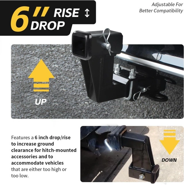 MaxxHaul 50650 Trailer Hitch Riser fits 2 inch hitch receivers and has a tongue weight capacity of 500 lbs. It features a 6 inch drop/rise to increase ground clearance for hitch-mounted accessories and to accommodate vehicles that are either too high or too low. It is also designed with heavy duty steel and has a black powder coat finish making it dust and corrosion resistant and provides a sturdy and reliable product. It also features three (3) pin holes to prevent any unncessary contact with your vehicle's rear bumper. For Sale By: Owner