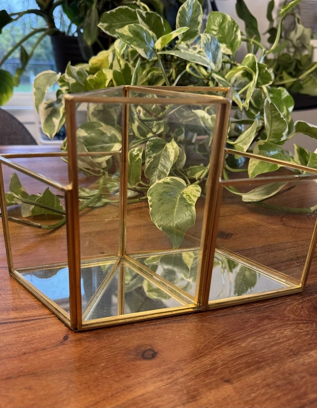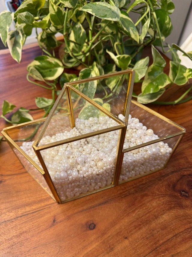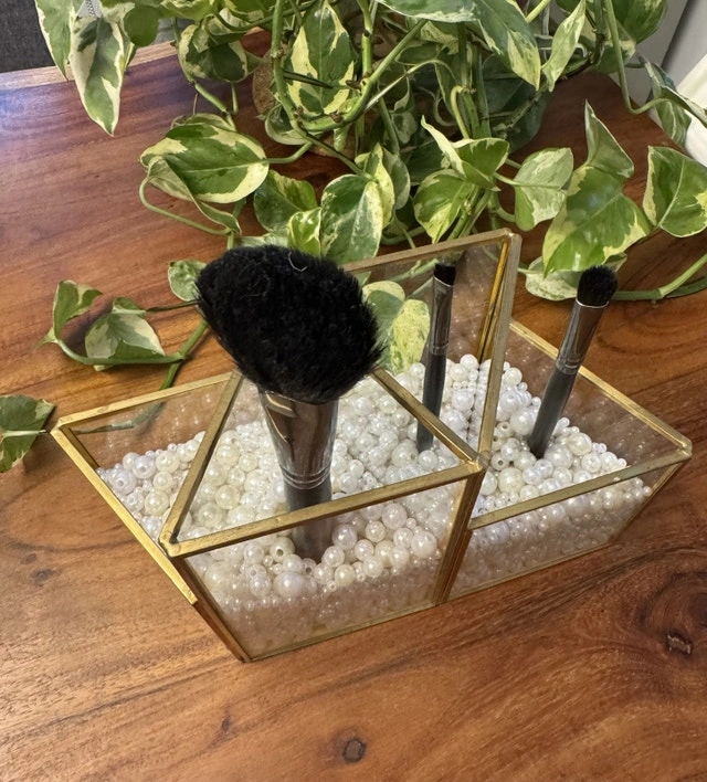 BRUSHES NOT INCLUDED. Includes gold organizer and beads. Can be used for make up / brushes, pens, etc. Different sized beads help hold upright items in place. Glass / bronze / mirrored desk organizer. approx 9” wide x 6” tall. Includes 3 x assorted size plastic beads from Michael’s (white and pearl). Price is firm. Pick up in St vital near Avalon and River.