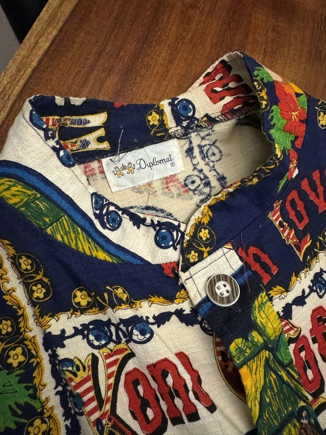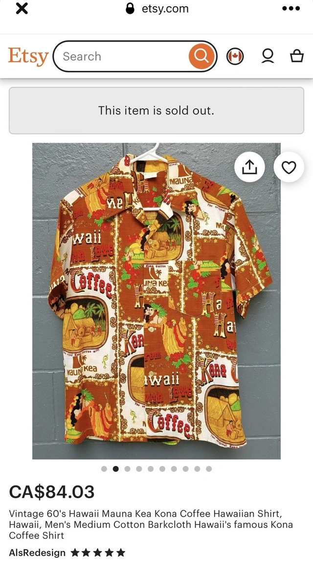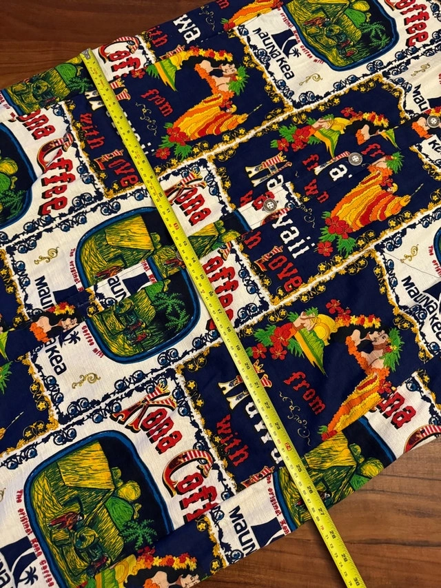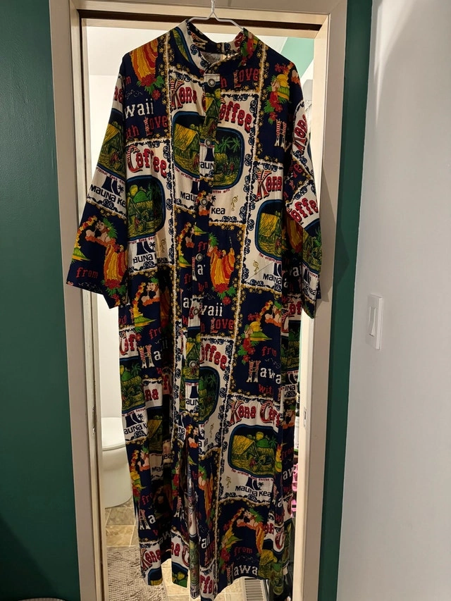 Vintage (1950’s/1960’s) Kona coffee robe from Hawaii. Buttons down front, long robe. Barkcloth. Tons of fabric if you wanted to make something different with the fabric! One size fits all (but is quite large, I would say it would be an XL/XXL if assigning a size) 54” long, 37” wide. Pick up in St vital near Avalon and River.