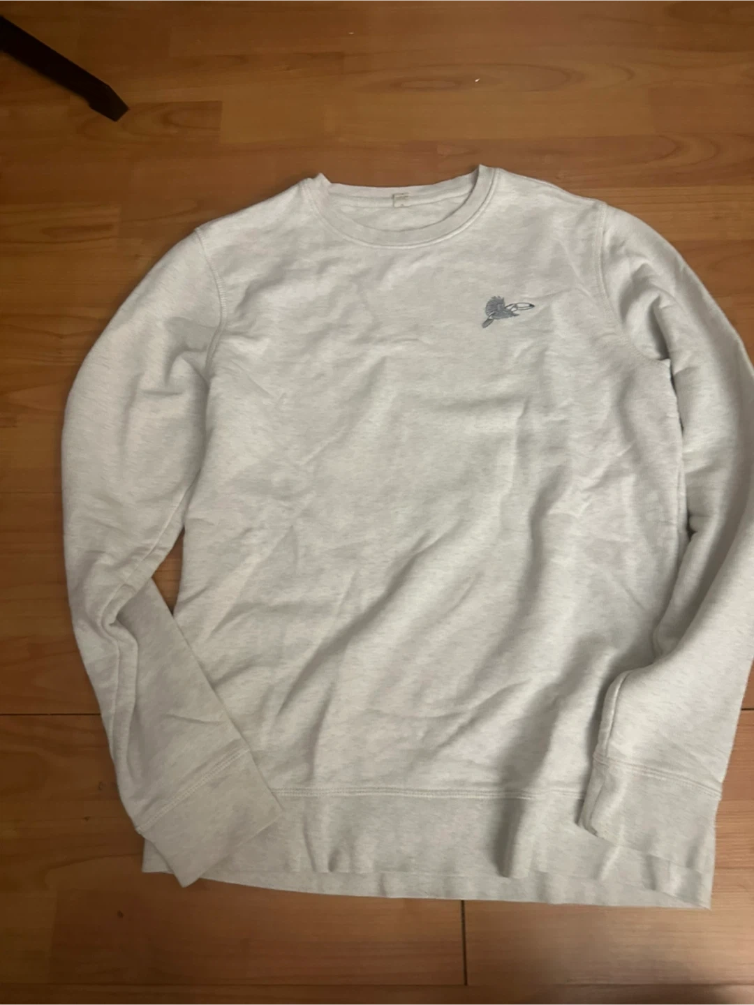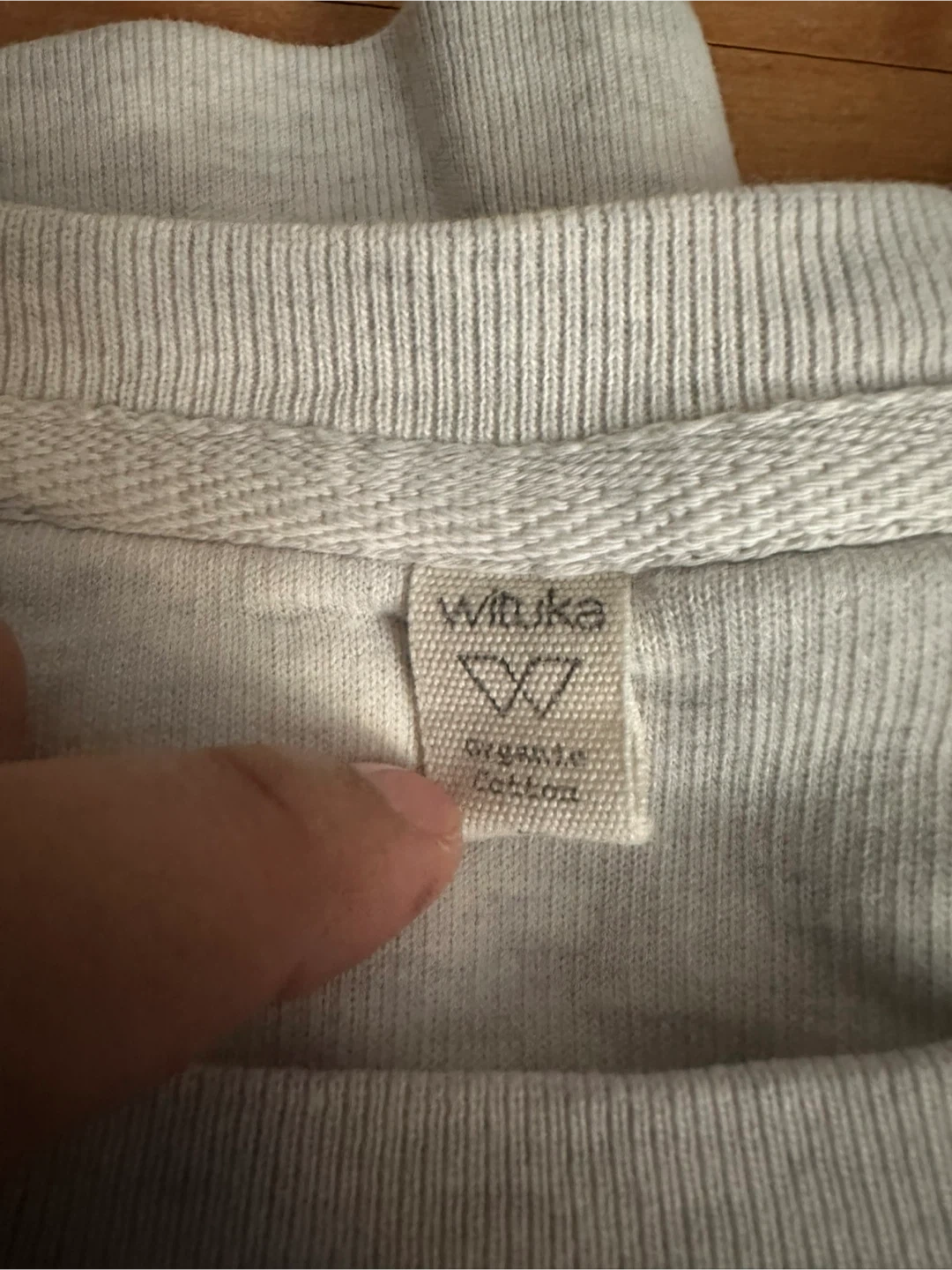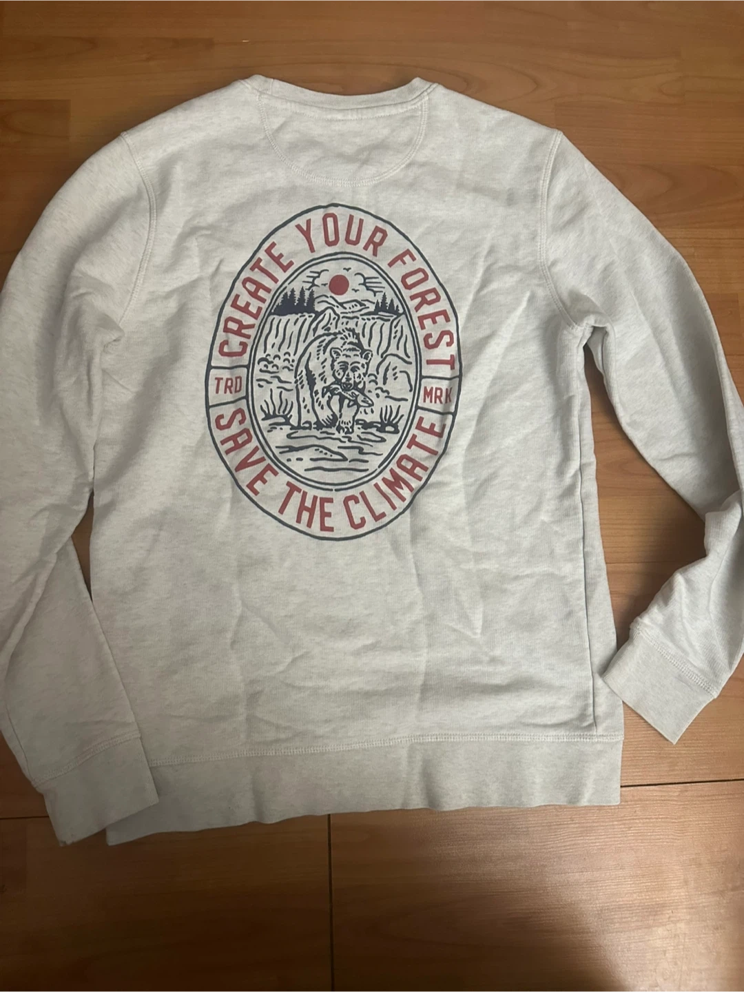 Selling a Witikia crewneck sweatshirt made from organic cotton. It's a light grey colour and features a 'Create Your Forest' design on the back. Perfect for layering or wearing on its own!