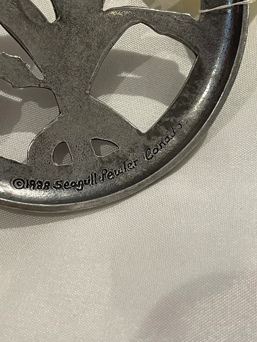 Selling a lovely Seagull Pewter ornament made in Canada. It features a beautiful floral design. The ornament is in great condition and measures approximately 7 cm in diameter. Perfect for adding a touch of Canadian craftsmanship to your home decor!