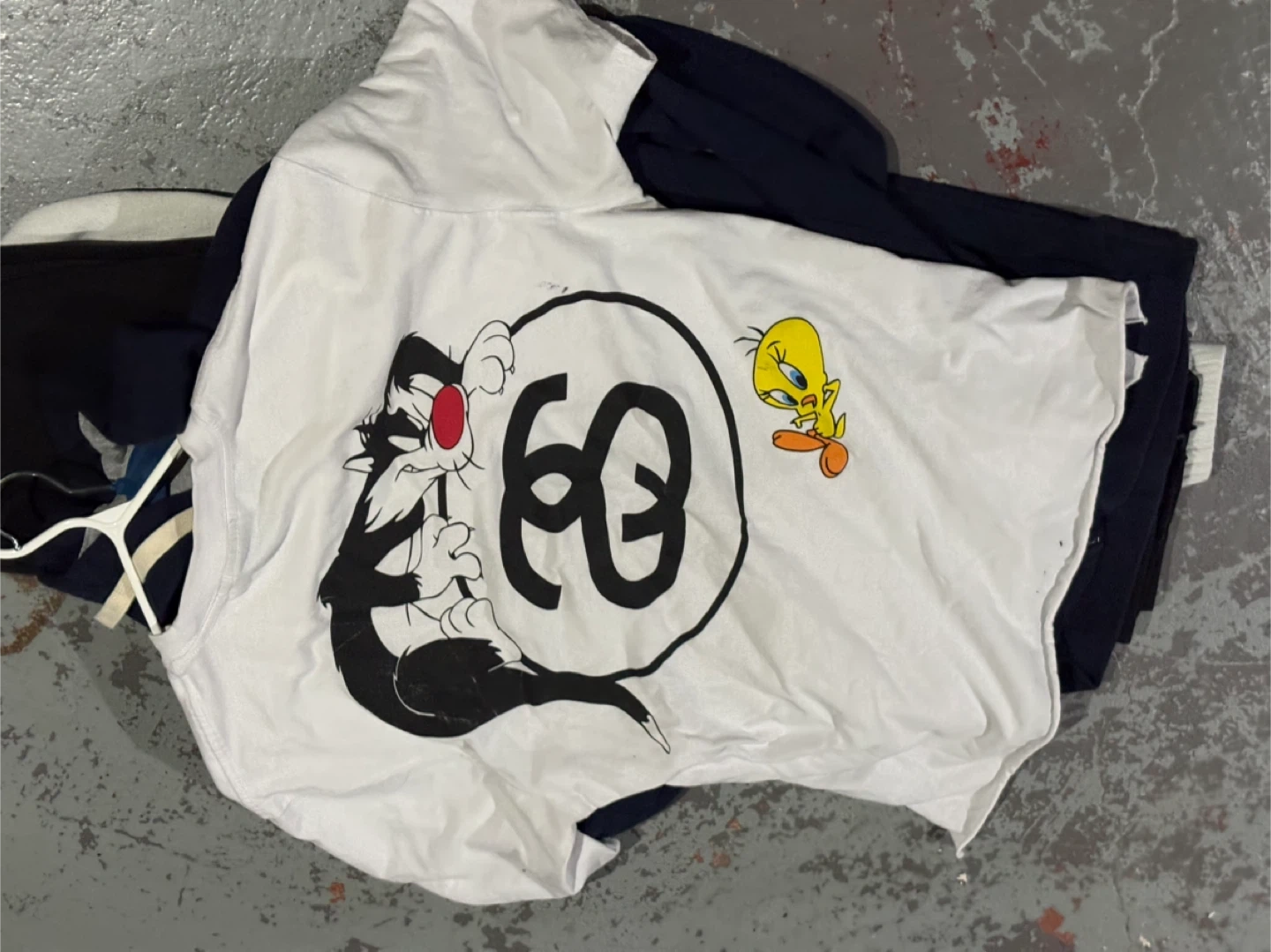 Selling a Stussy x Looney Tunes T-shirt in size large! It's a white tee with a fun graphic print featuring Sylvester and Tweety Bird. Perfect for any fan of the classic cartoon or streetwear!