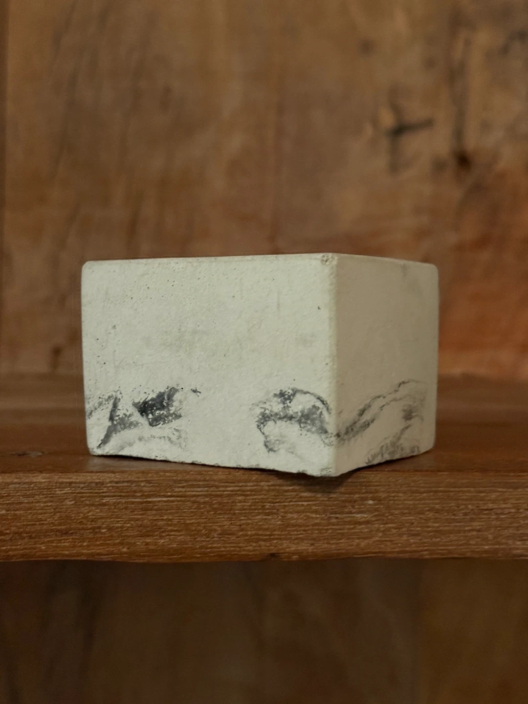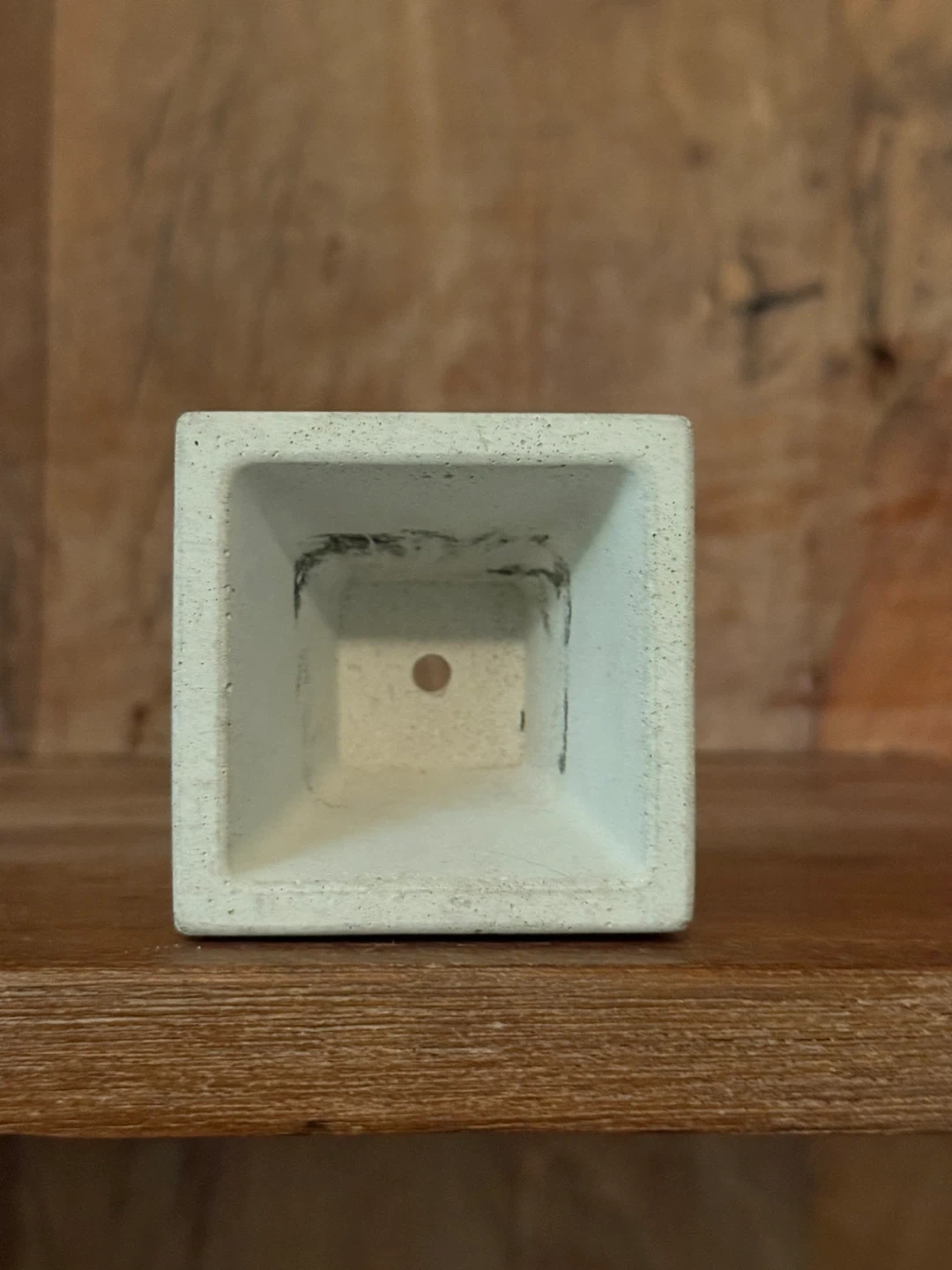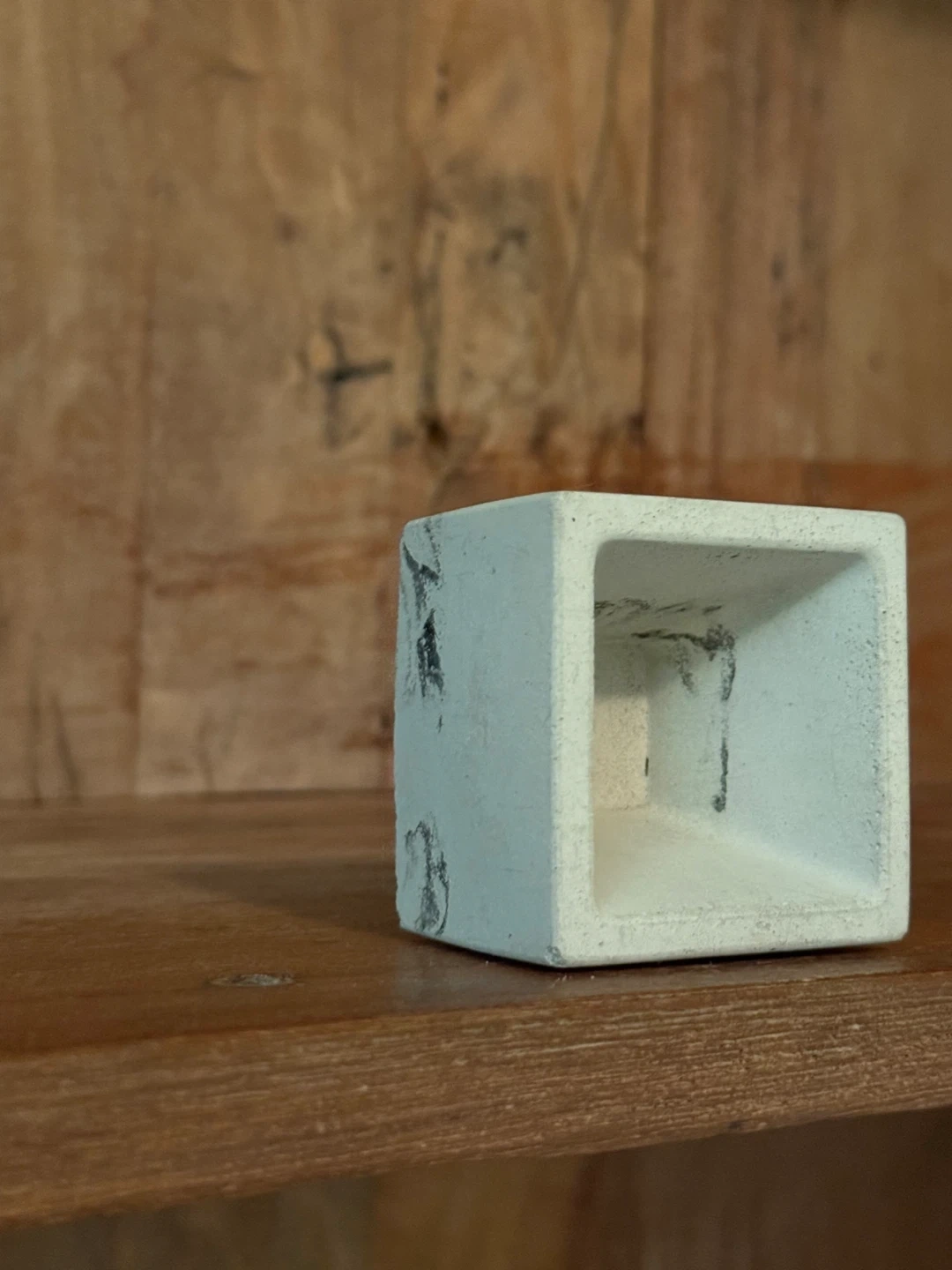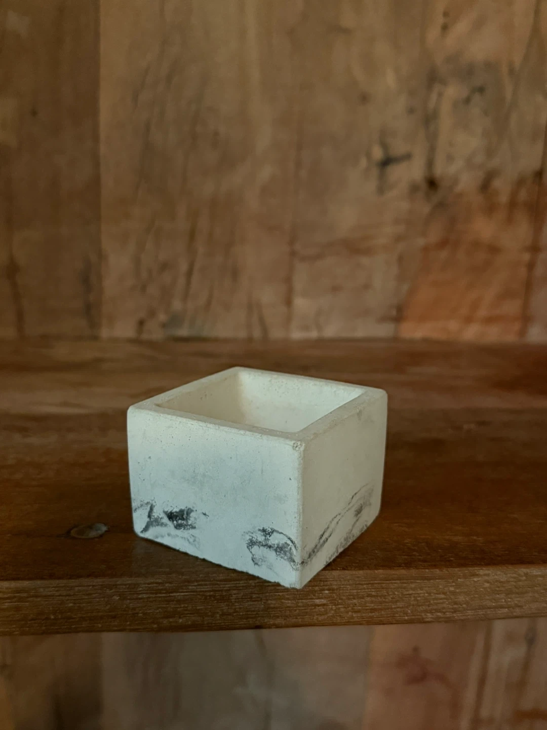 I'm selling a handmade square concrete planter. It has a unique marbled design on the outside. It's perfect for small succulents or cacti! Never used.