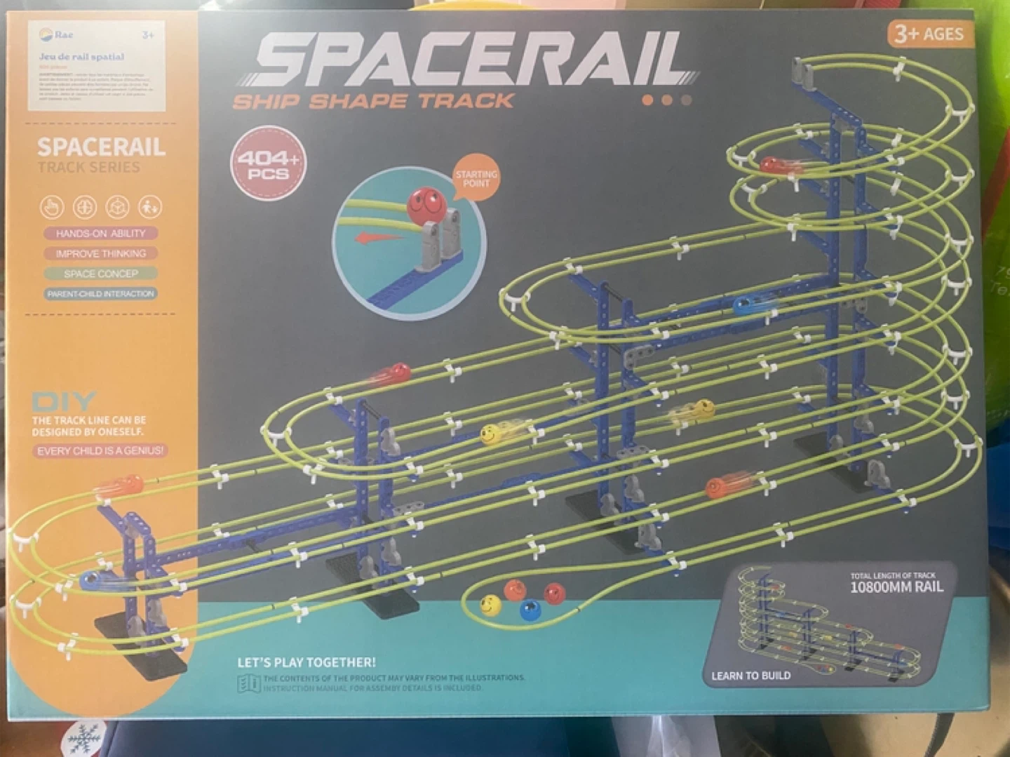 Selling a SpaceRail Ship Shape Track brain game! It's suitable for ages 3+. The box includes 404+ pieces to build your own track. The total length of the track is 10800mm. It's a fun DIY project that encourages hands-on ability, improves thinking, and fosters parent-child interaction