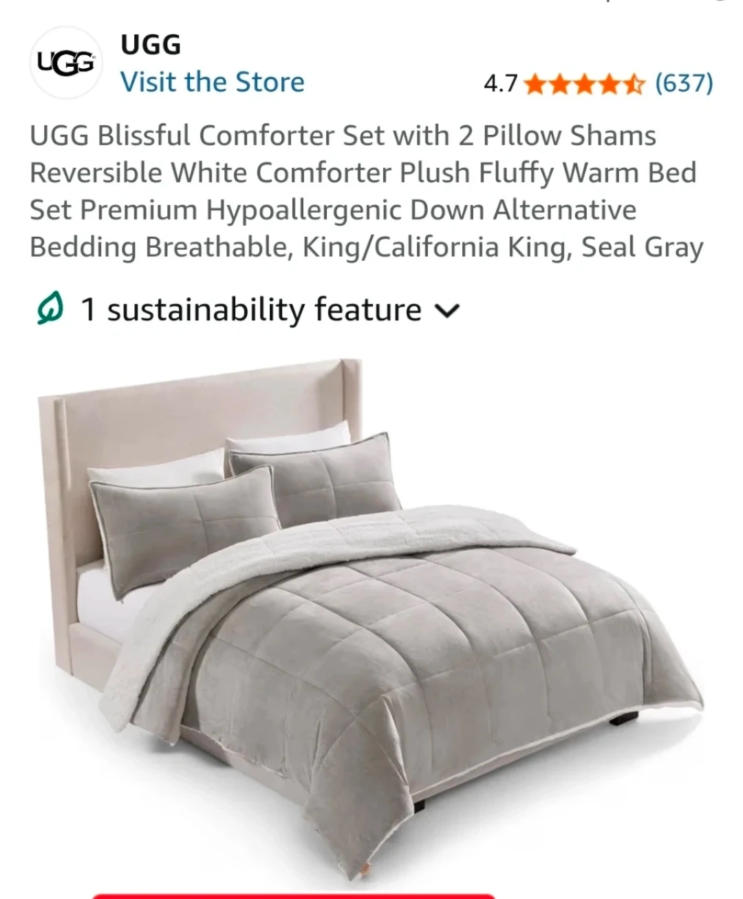 Selling an UGG Blissful Comforter Set with 2 Pillow Shams. This set is King/California King size and comes in Seal Gray. It's reversible, white, plush, fluffy, and warm, making it a perfect bedding set. It's also premium hypoallergenic down alternative bedding and breathable. Originally, the market price was $375!