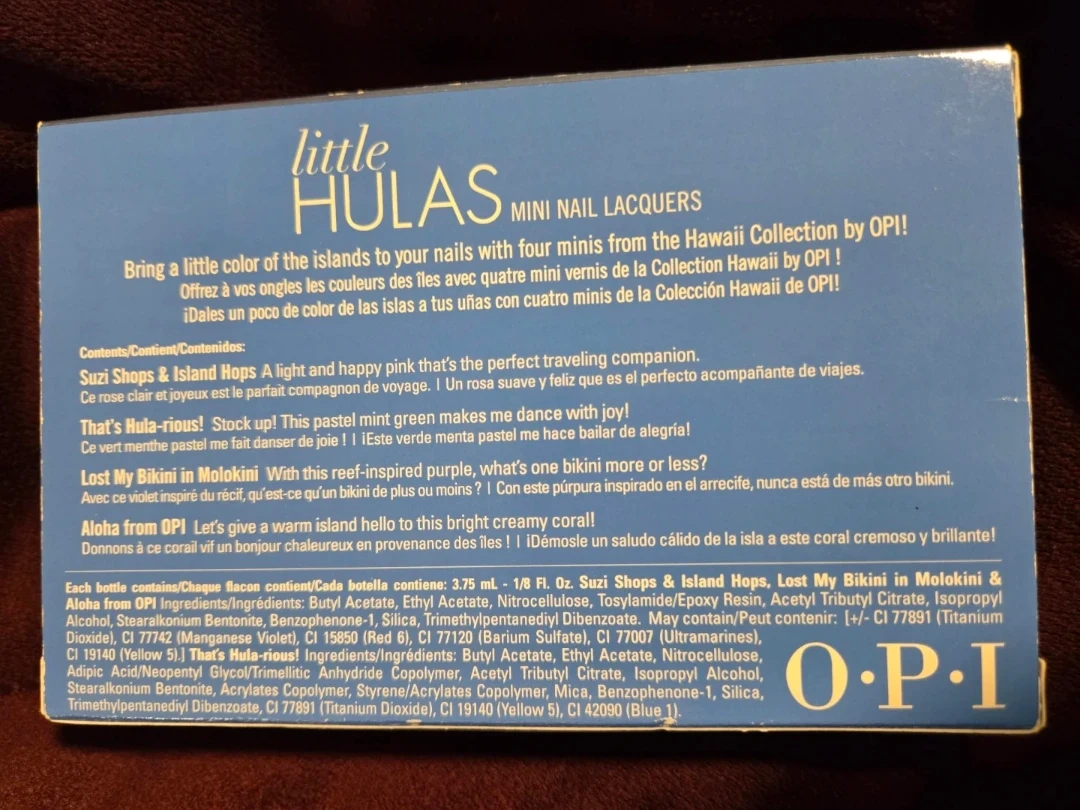 Selling a set of OPI Hawaii Collection mini nail lacquers! This set includes four beautiful colours: Suzi Shops & Island Hops, That's Hula-rious!, Lost My Bikini in Molokini, and Aloha from OPI. Each bottle contains 3.75 mL / 1/8 Fl. Oz. Get ready to bring a little colour of the islands to your nails!