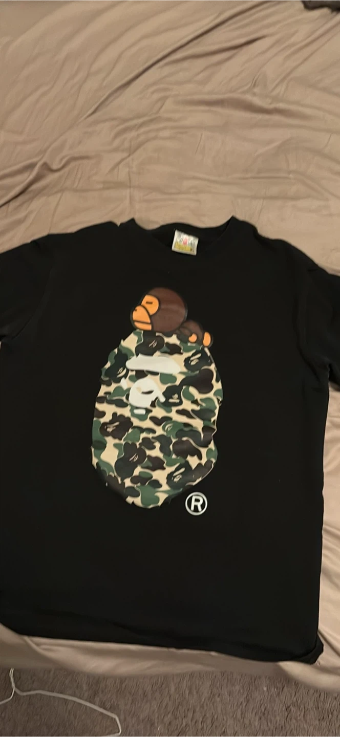 Selling a gently used black Bathing Ape (BAPE) t-shirt with the iconic camo ape head design. It's in great condition and ready for a new home!