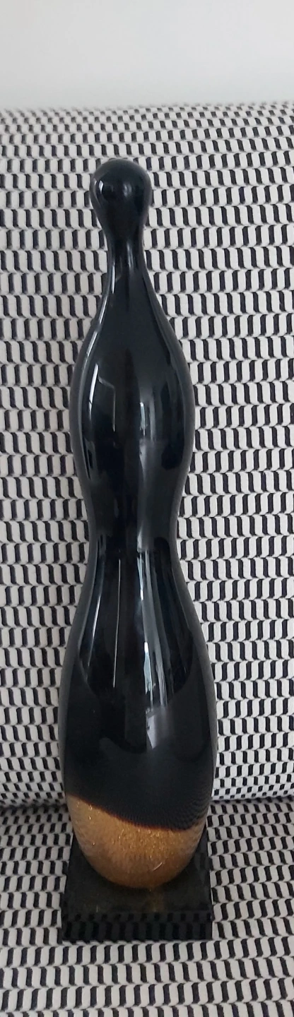 Abstract human glass like statue in shiny black and glitter gold swirl at the bottom. Very modern museum look. Lovely piece of art.