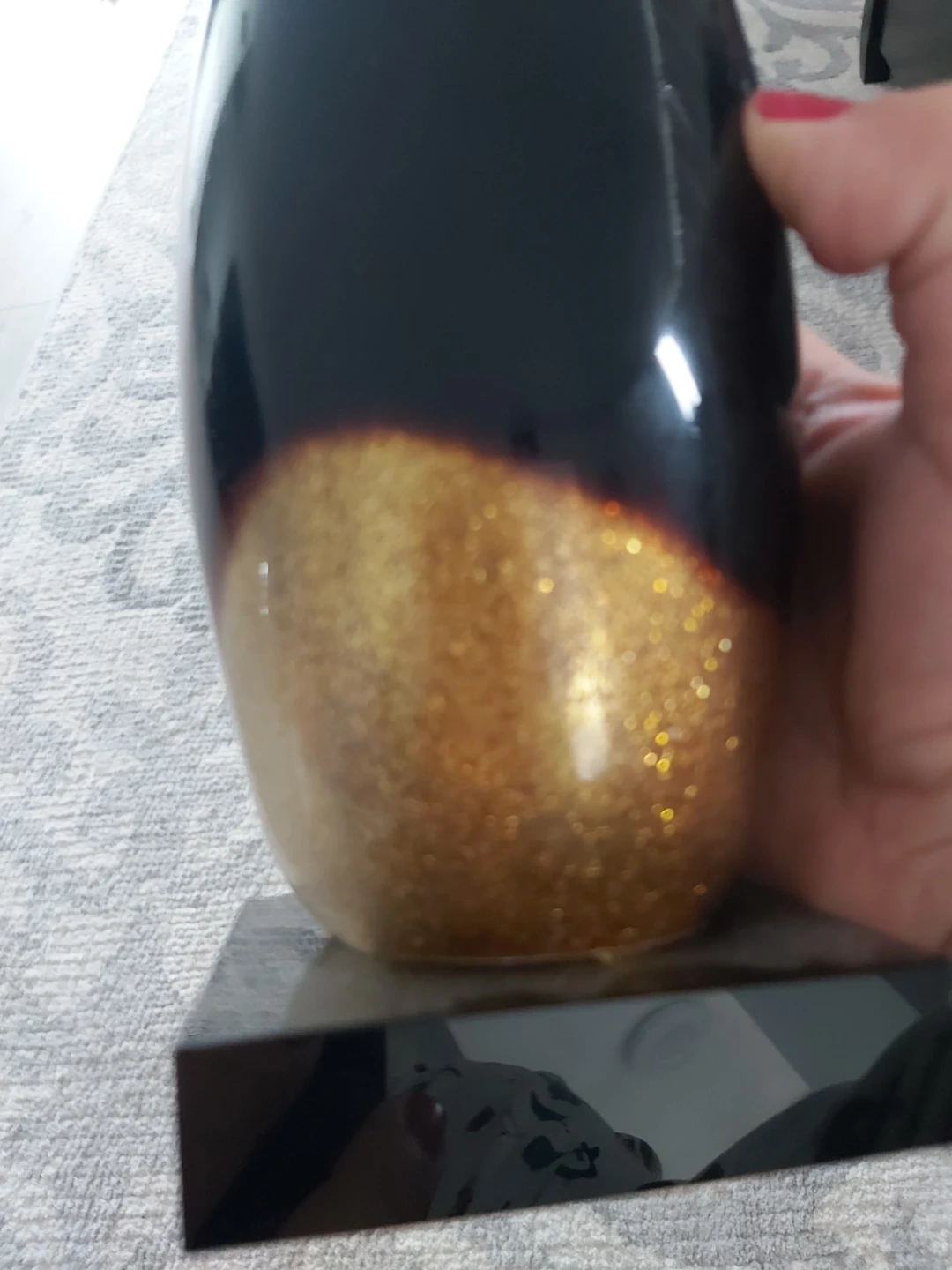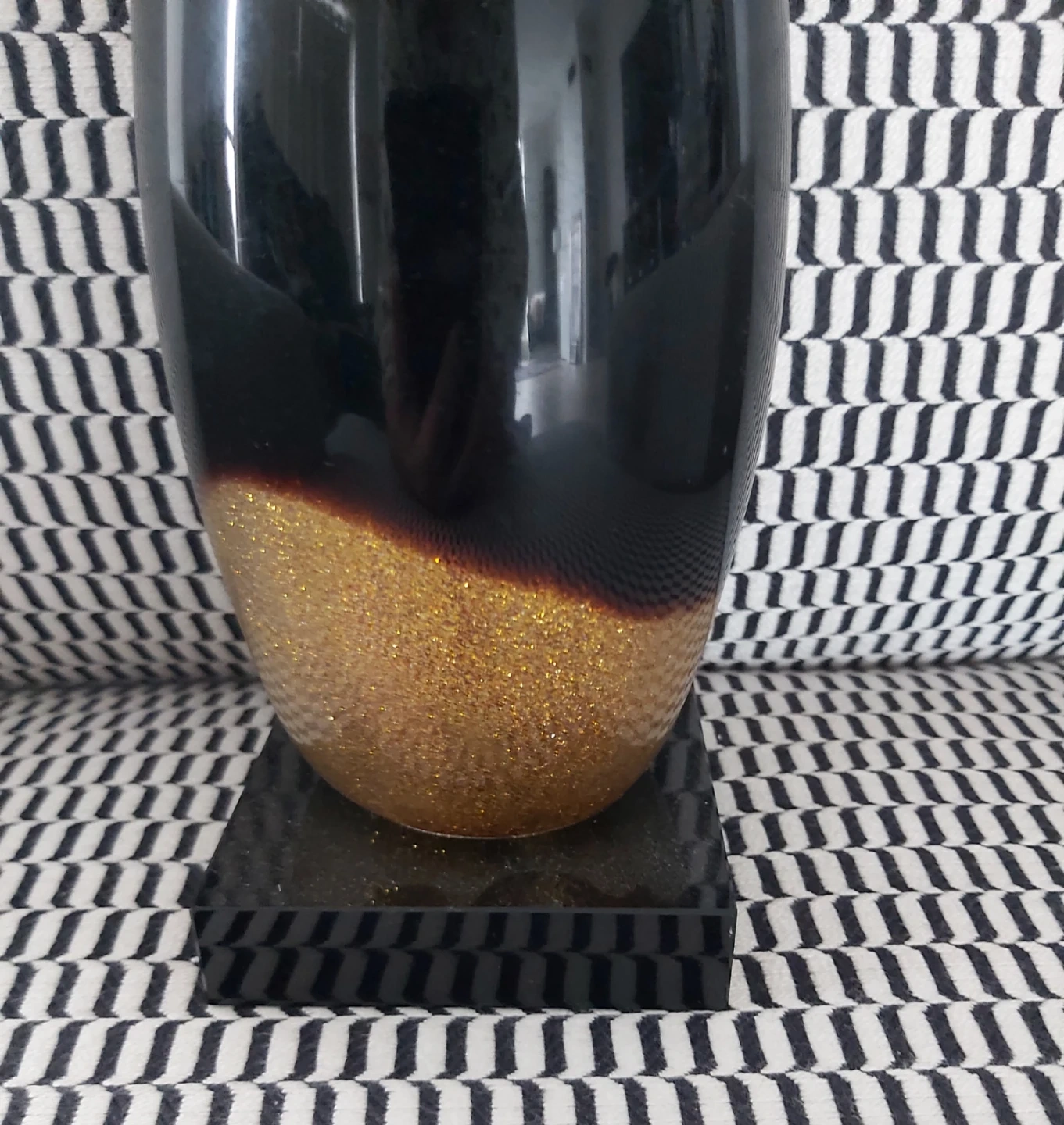 Abstract human glass like statue in shiny black and glitter gold swirl at the bottom. Very modern museum look. Lovely piece of art.