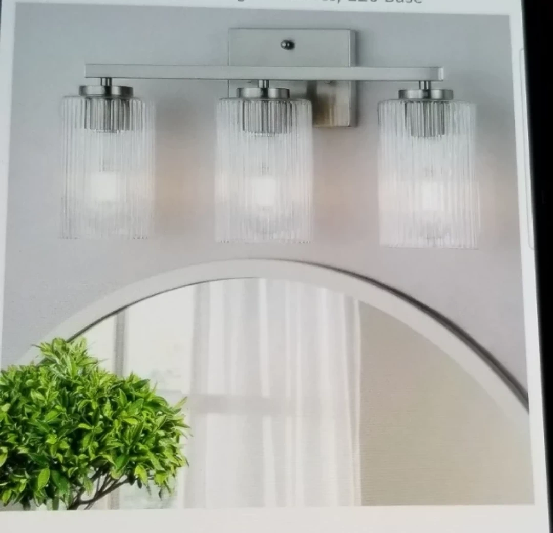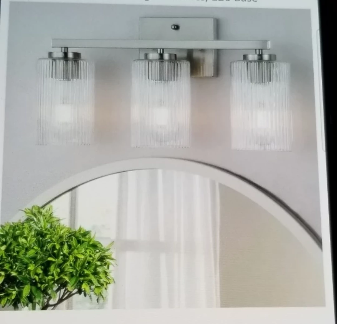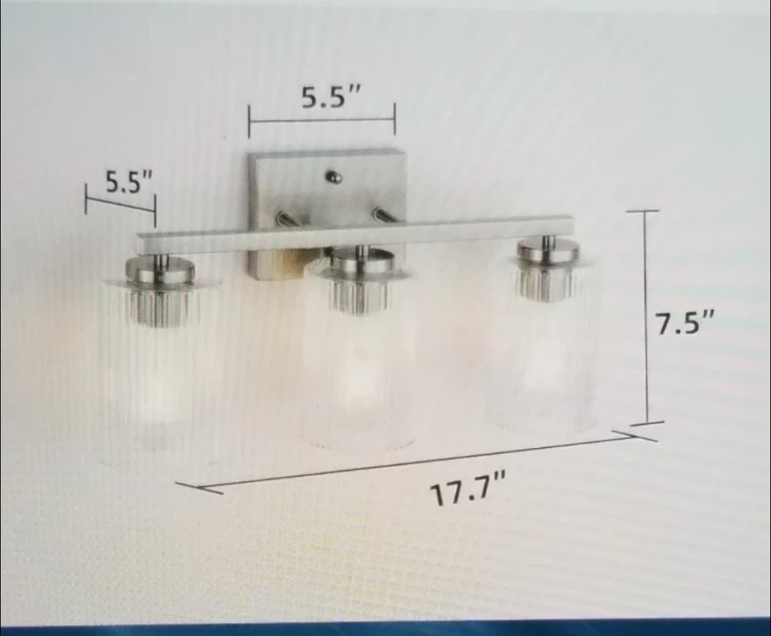 Selling a brand new Huong Son 3-Light Brushed Nickel Bathroom Vanity Light! It's still in its original packaging. The dimensions are 17.7" in length, 5.5" in width, and 7.5" in height. Dimmable and uses E26 base bulbs.