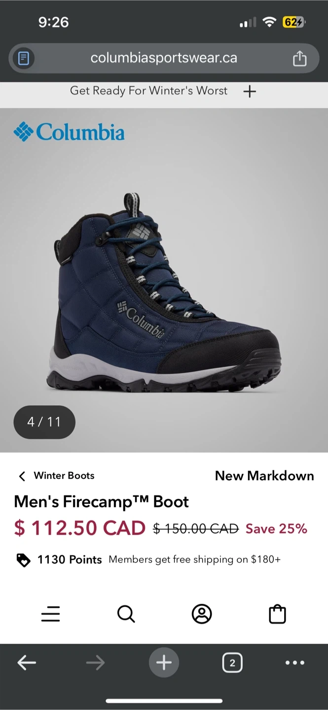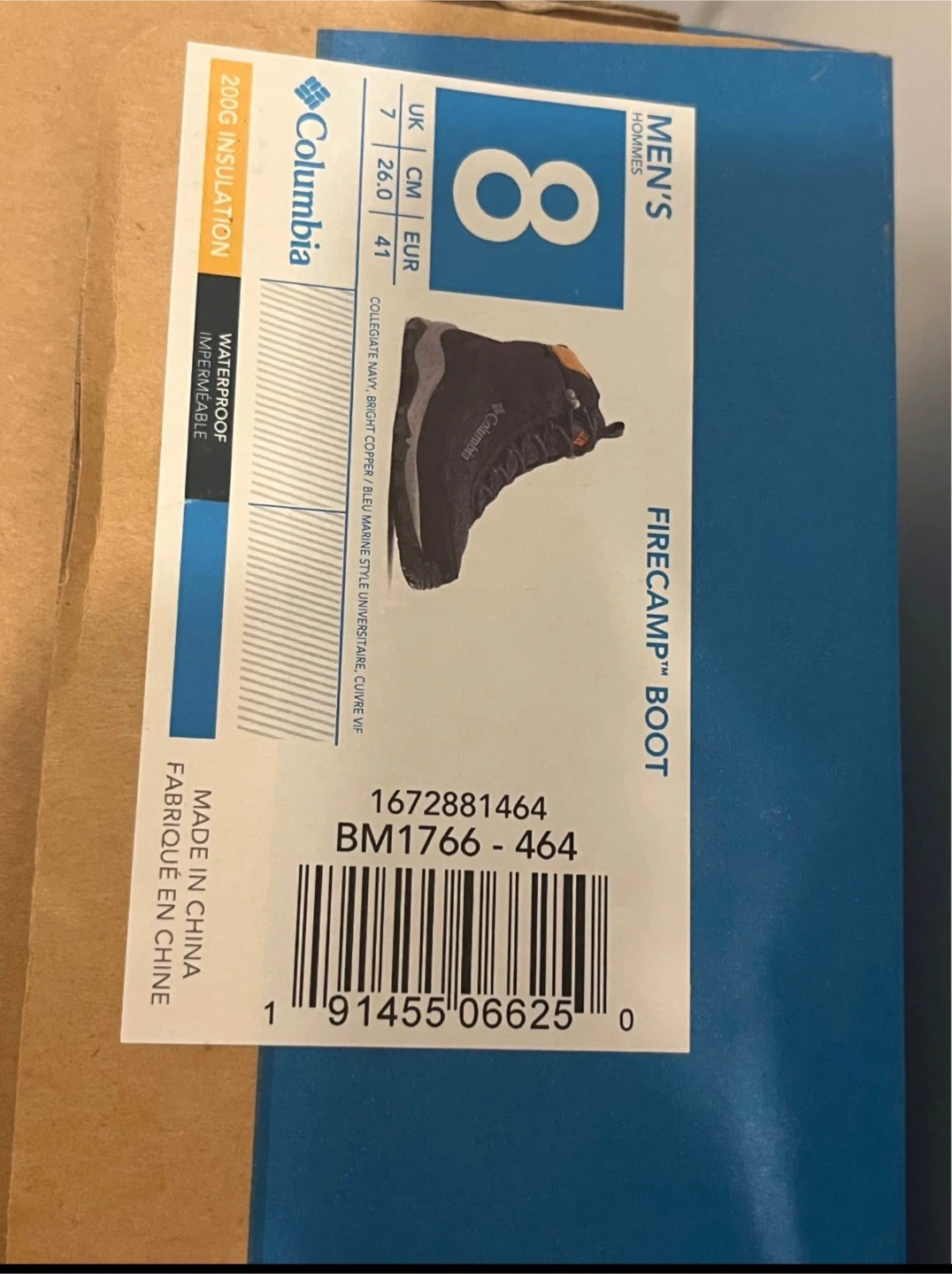 Selling a pair of Columbia Firecamp Boots for men, size 8. These boots feature 200g insulation and are waterproof. The colour is Collegiate Navy/ Bright Copper.
