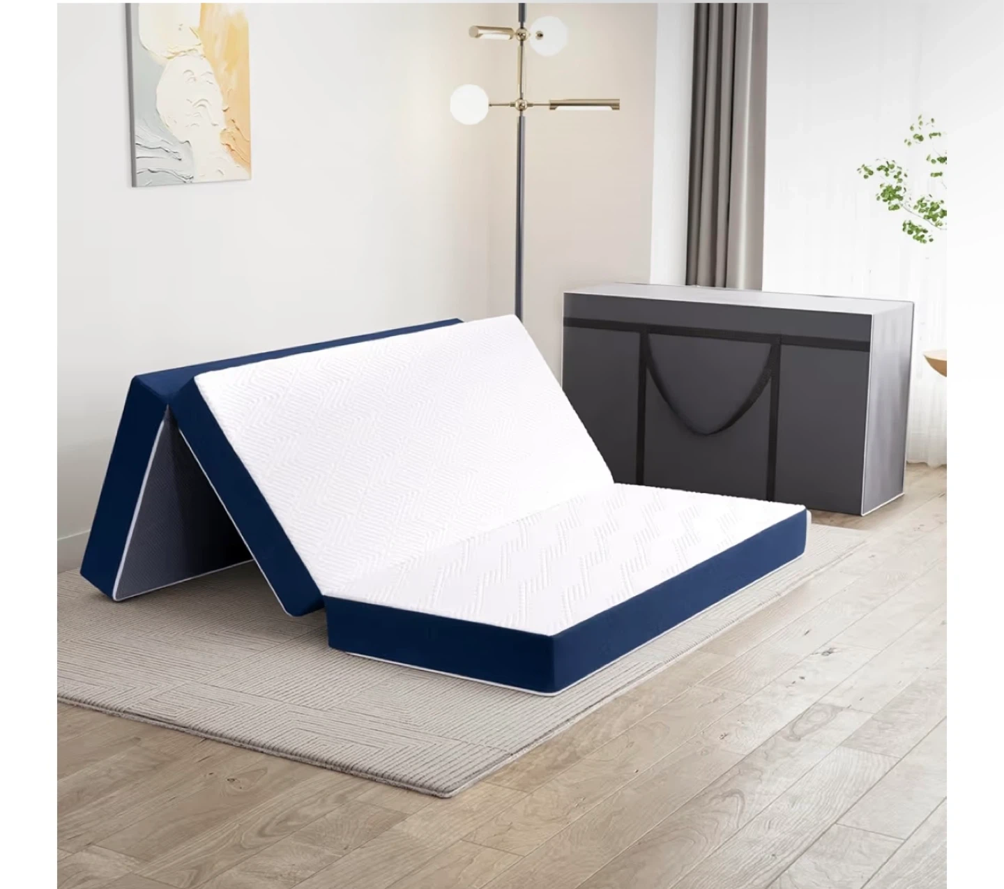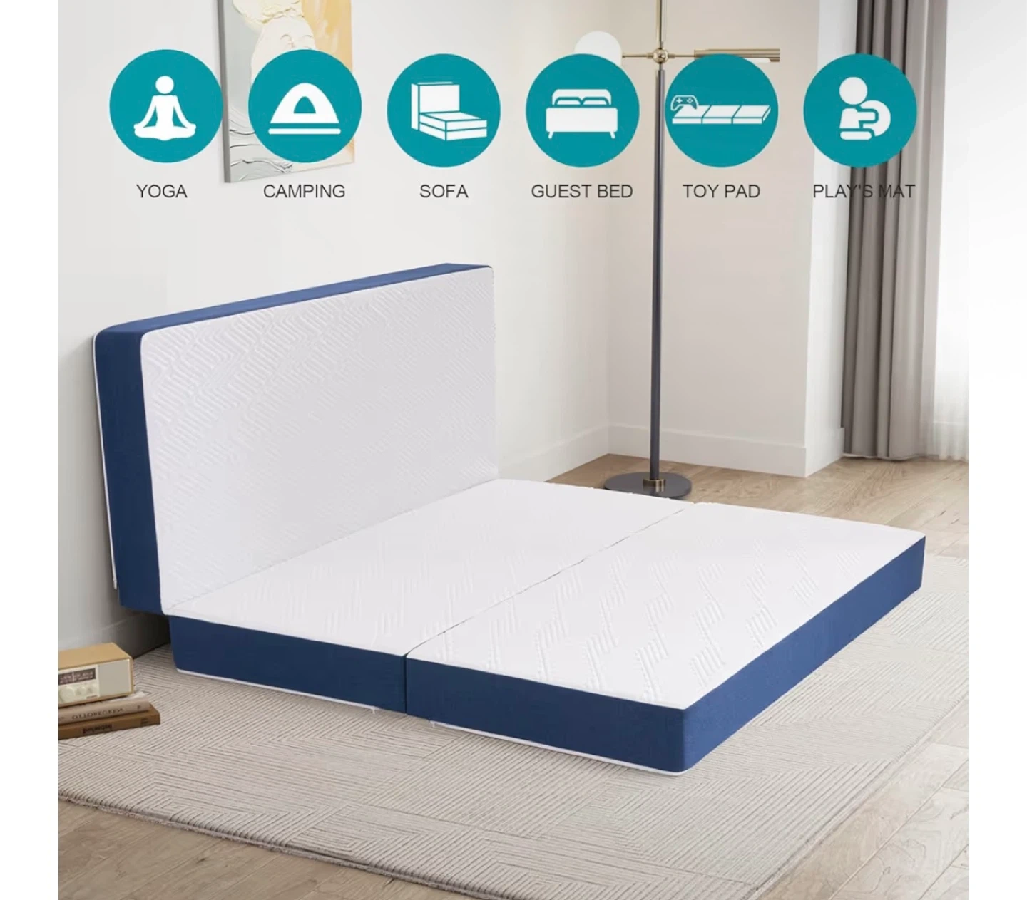 This is a tri-fold mattress in a twin size, perfect for yoga, camping, or as a bed! It's blue and white, and comes with a carrying case. When unfolded, it is 75" x 38" x 6". Comes with premium mattress protector.