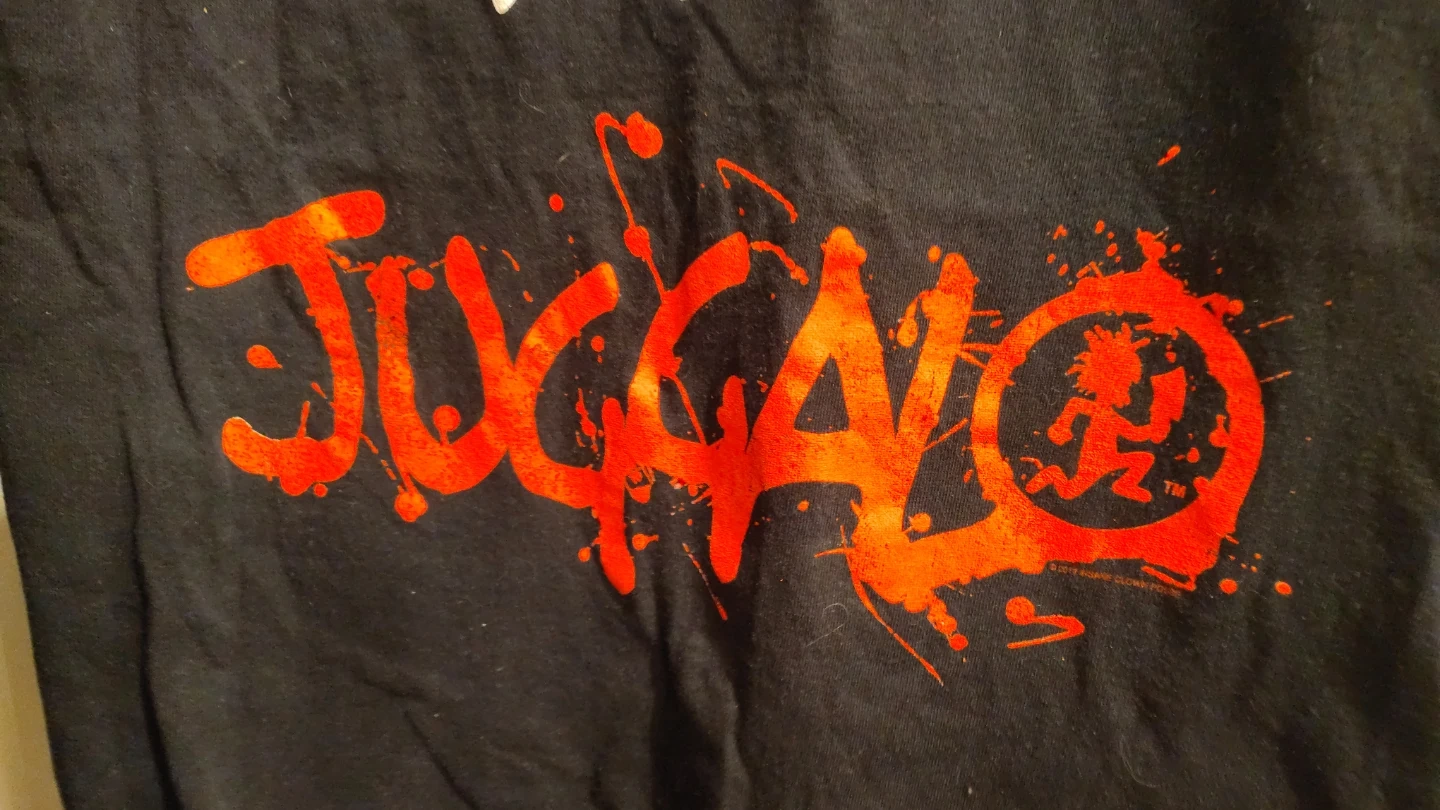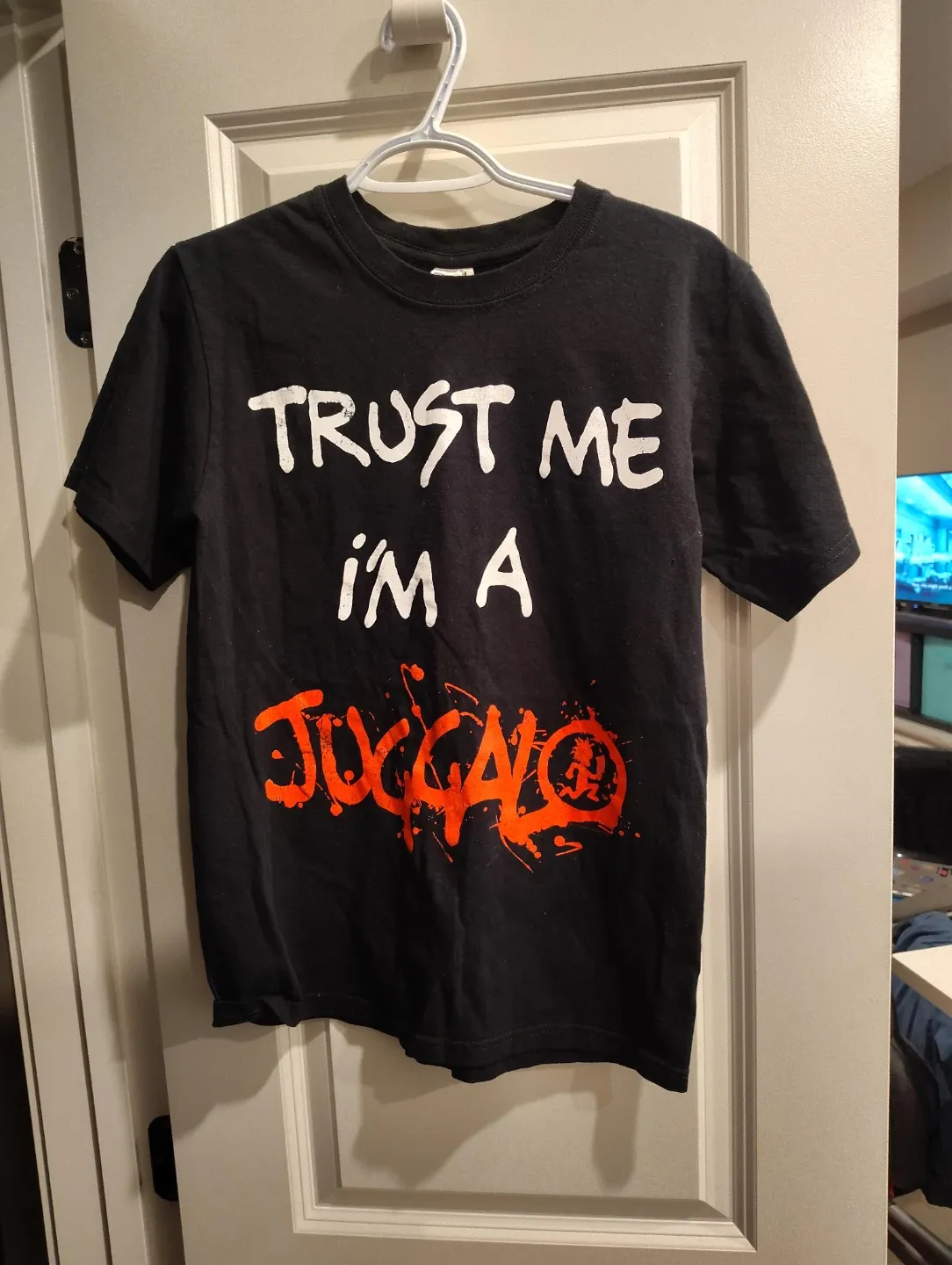 Black t-shirt with the text "TRUST ME I'M A JUGGALO" with the iconic Hatchetman logo. Great for any fan of Insane Clown Posse! Brand new, never worn.