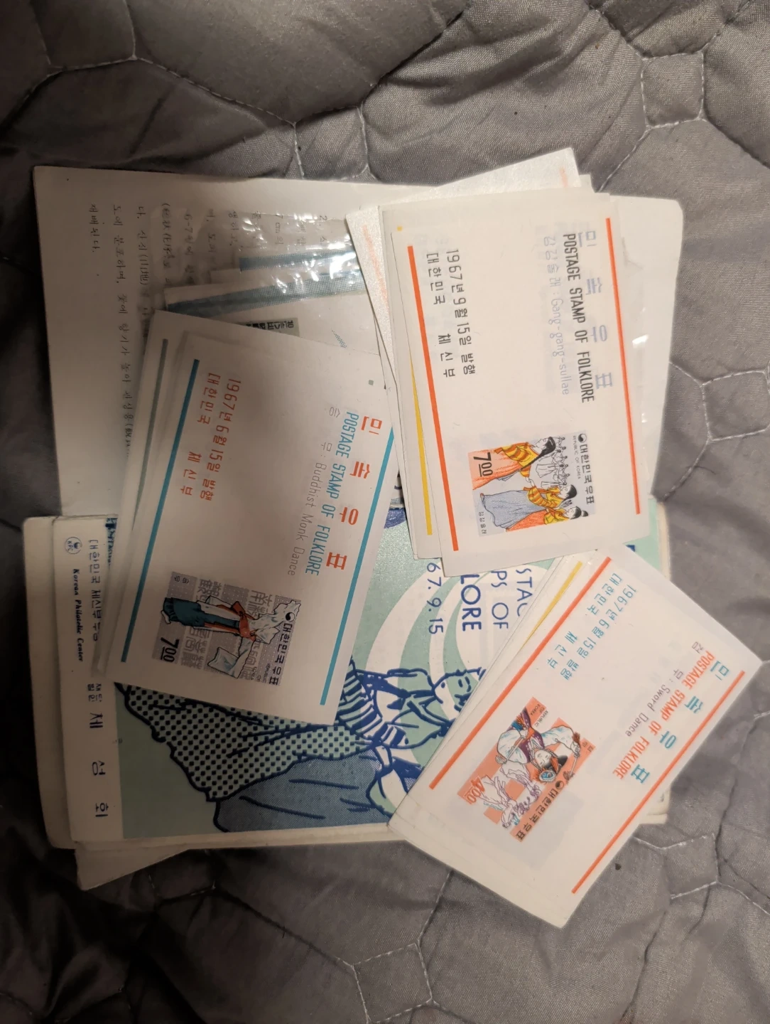 Selling a collection of vintage Korean postage stamps from 1967. These stamps are a piece of history, featuring traditional folk themes like Gang-gang-sullae and Buddhist Monk Dance. A great addition for any stamp collector!
