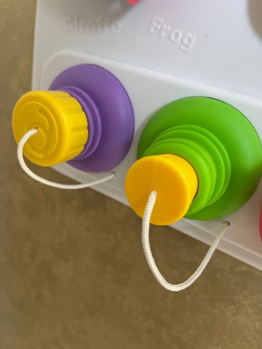 I taped it to the wall so that my baby can stand and enjoy this activity. It is a great toy to keep your baby entertained, good for motor skills, gives them practice to open bottle cap, pulling and pushing.