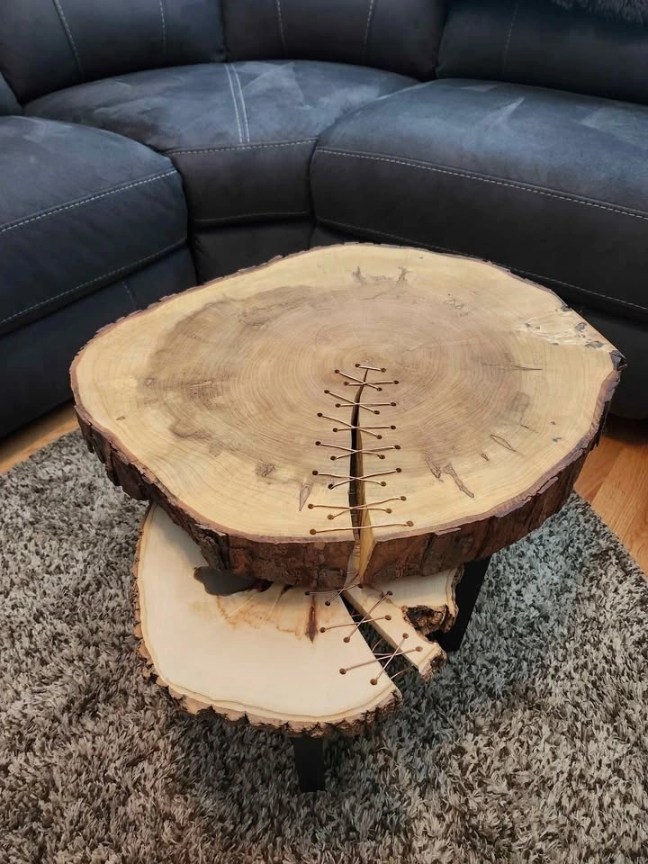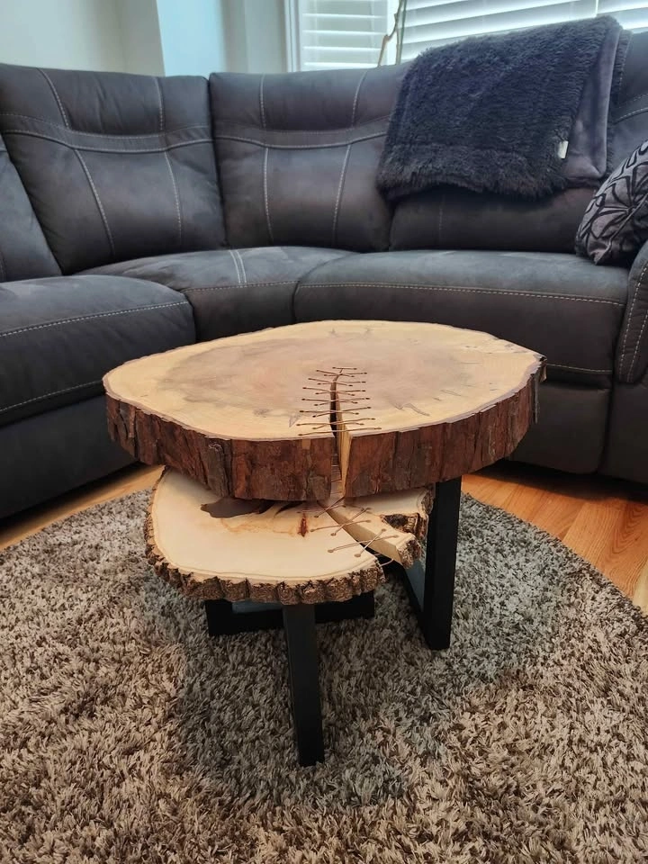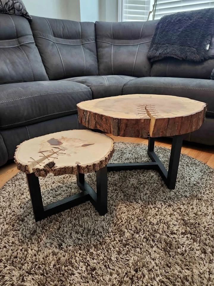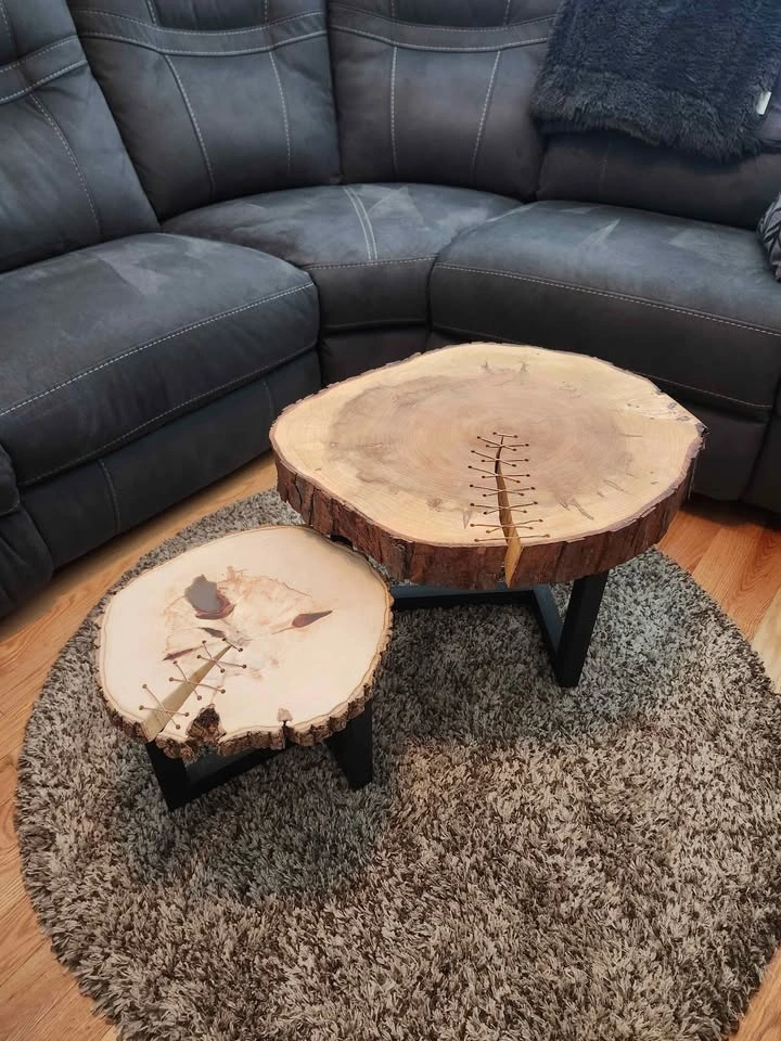 This hand crafted table set is the perfect combination of rustic and modern. The copper wire accents the natural tones in the wood beautifully and the bark left intact gives them a natural cozy cabin feel. The knots are filled with a clear epoxy to increase functionality and enhance their appearance. The bark has been sealed with polyurethane to protect and strengthen the bond and the surfaces were sealed with Odies hardwax oil for durability and scratch resistance.