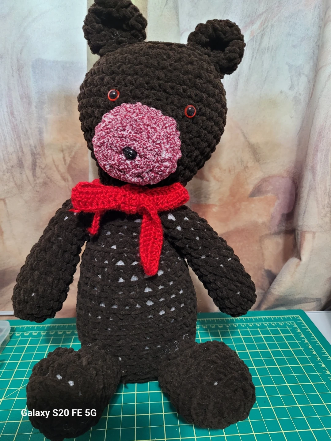 This is a handmade crochet teddy bear. It's a dark brown colour with a pink and white nose and a cute red scarf. It's in great condition and ready for a new home!