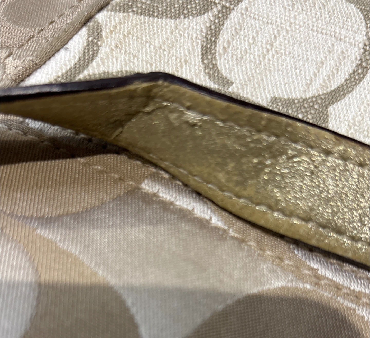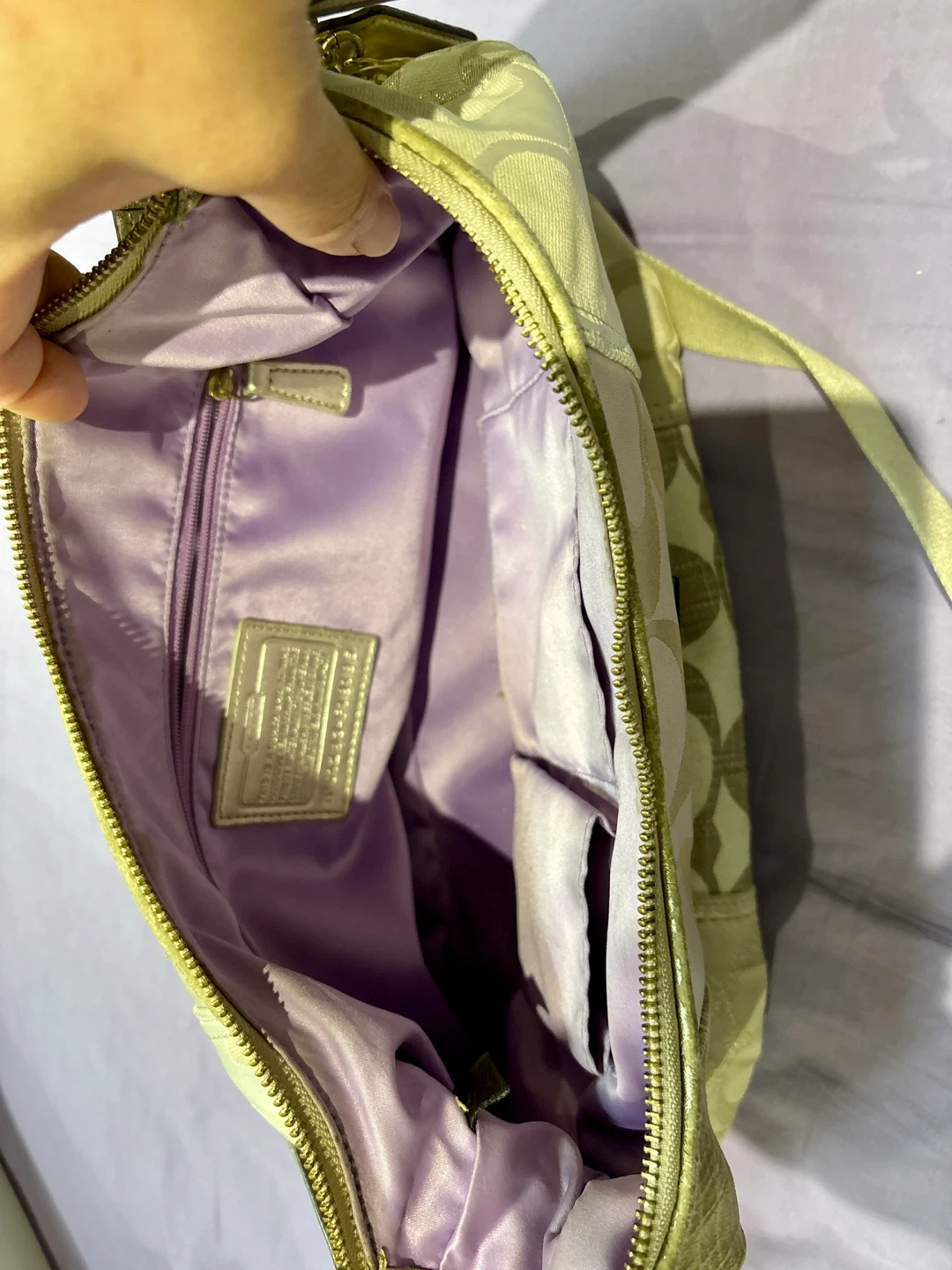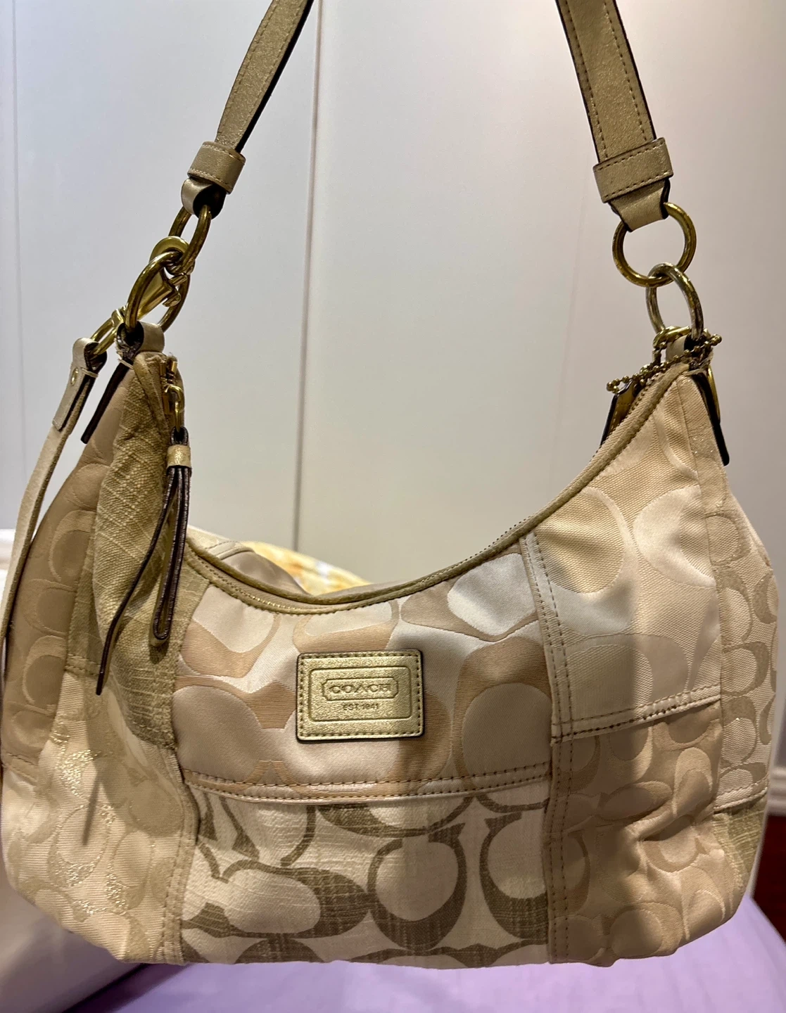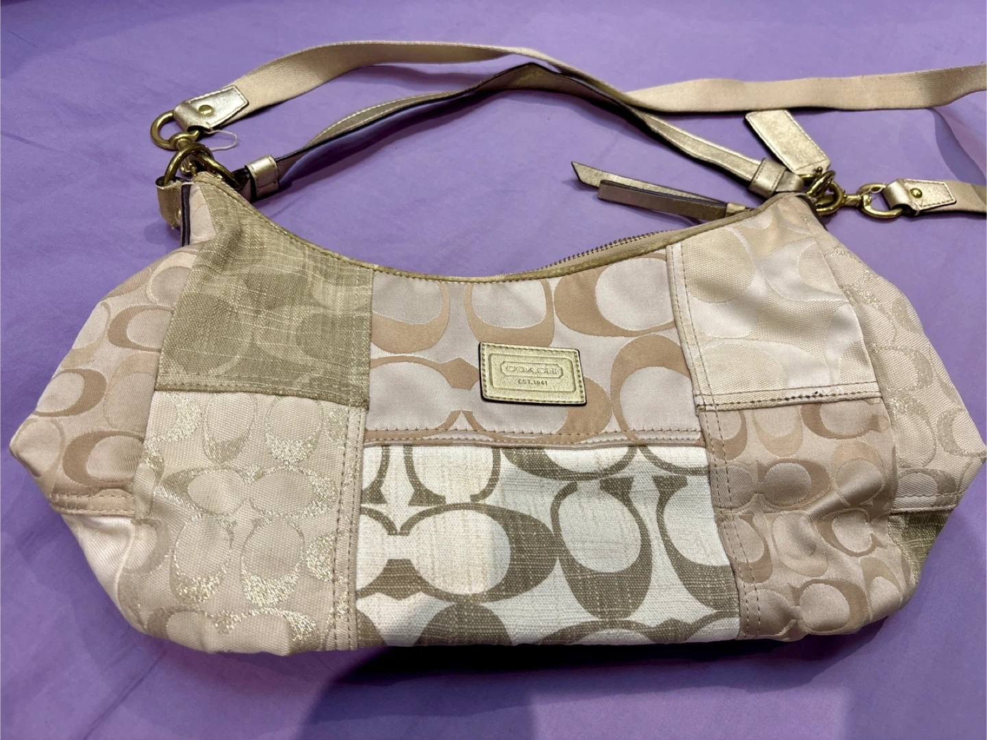 Selling a Coach patchwork hobo bag. The model number is F19195. It has a zipper closure and a shoulder strap. There is a small stain at the bottom of the bag and show some signs of wear.