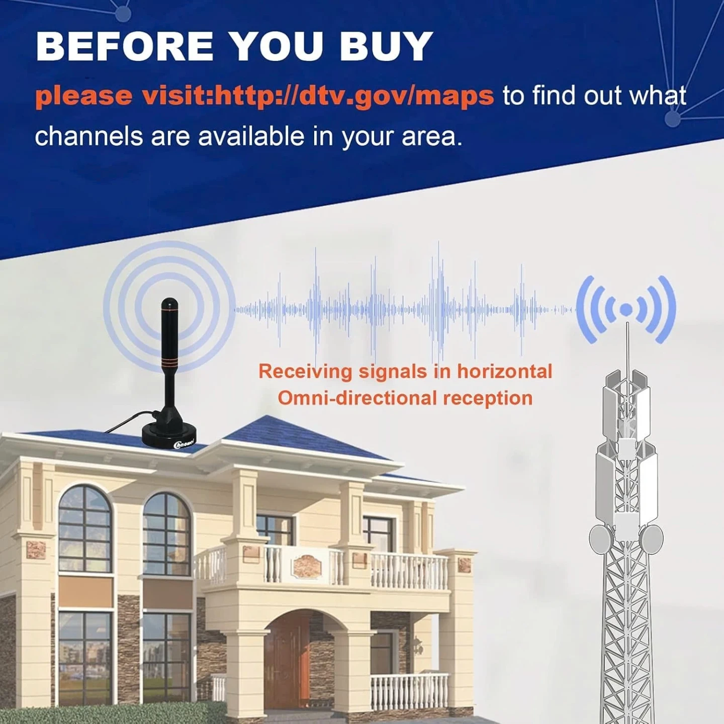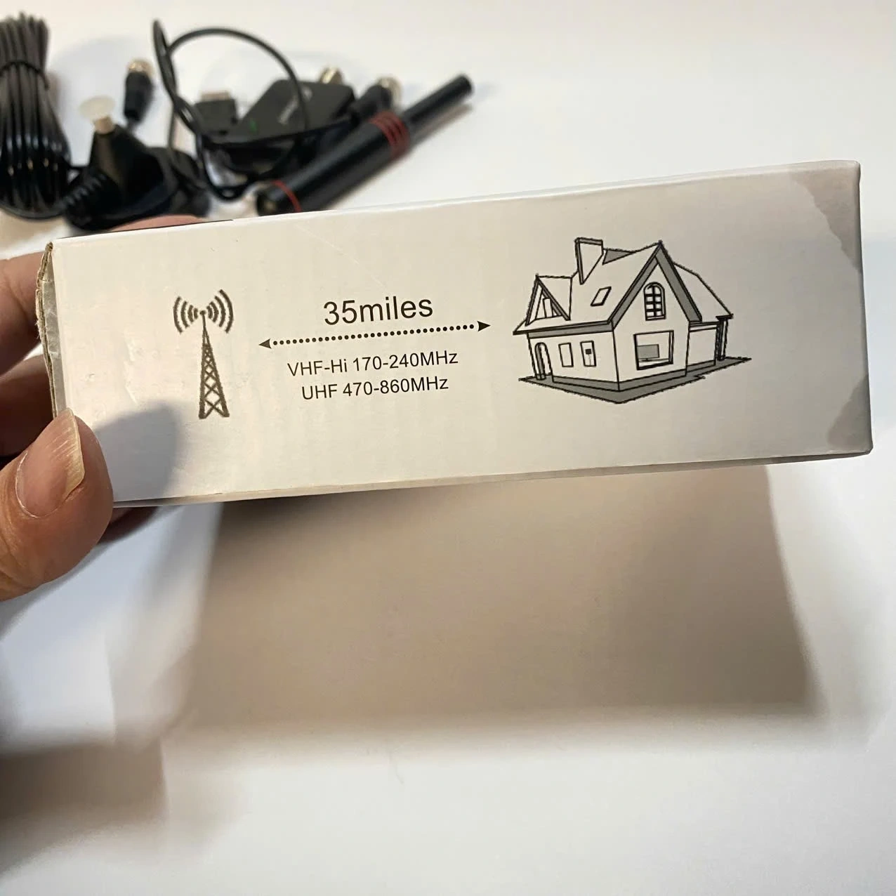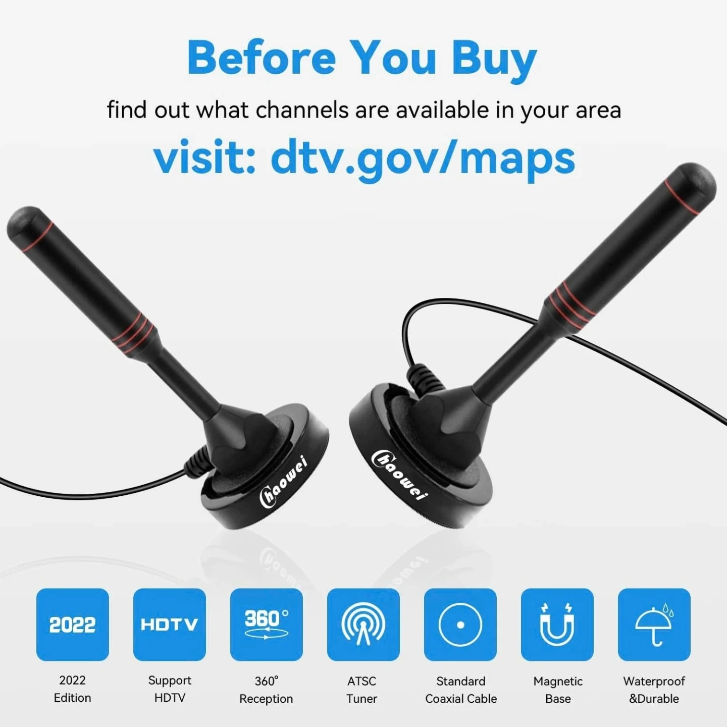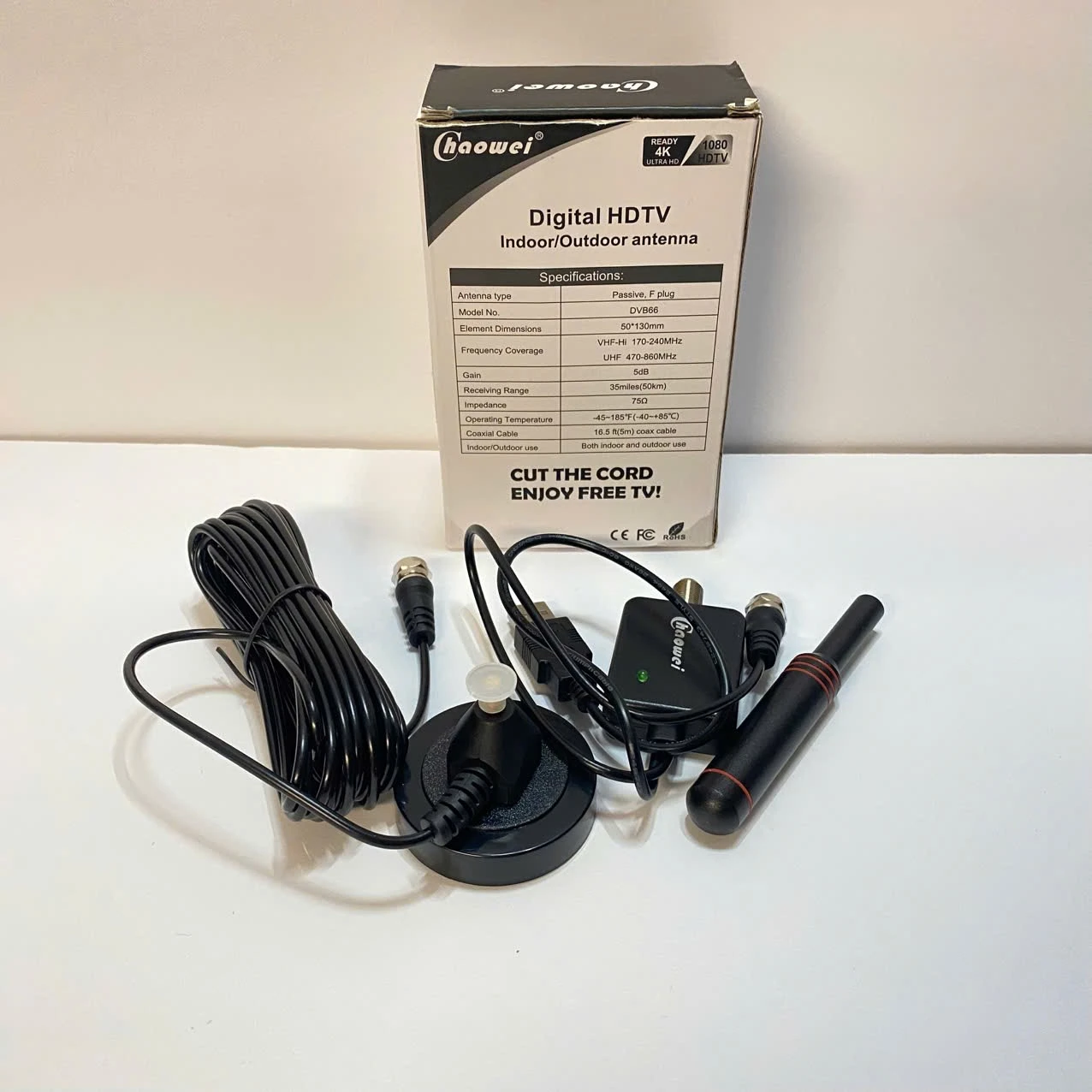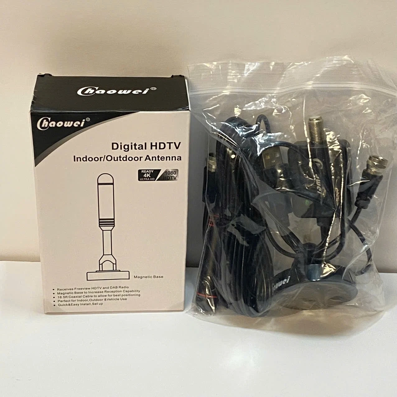 Selling a brand new Haowei Digital HDTV Indoor/Outdoor Antenna! This antenna supports HDTV and has a 360° reception. It comes with a standard coaxial cable and a magnetic base. It's waterproof and durable, perfect for both indoor and outdoor use. Also included is the original box