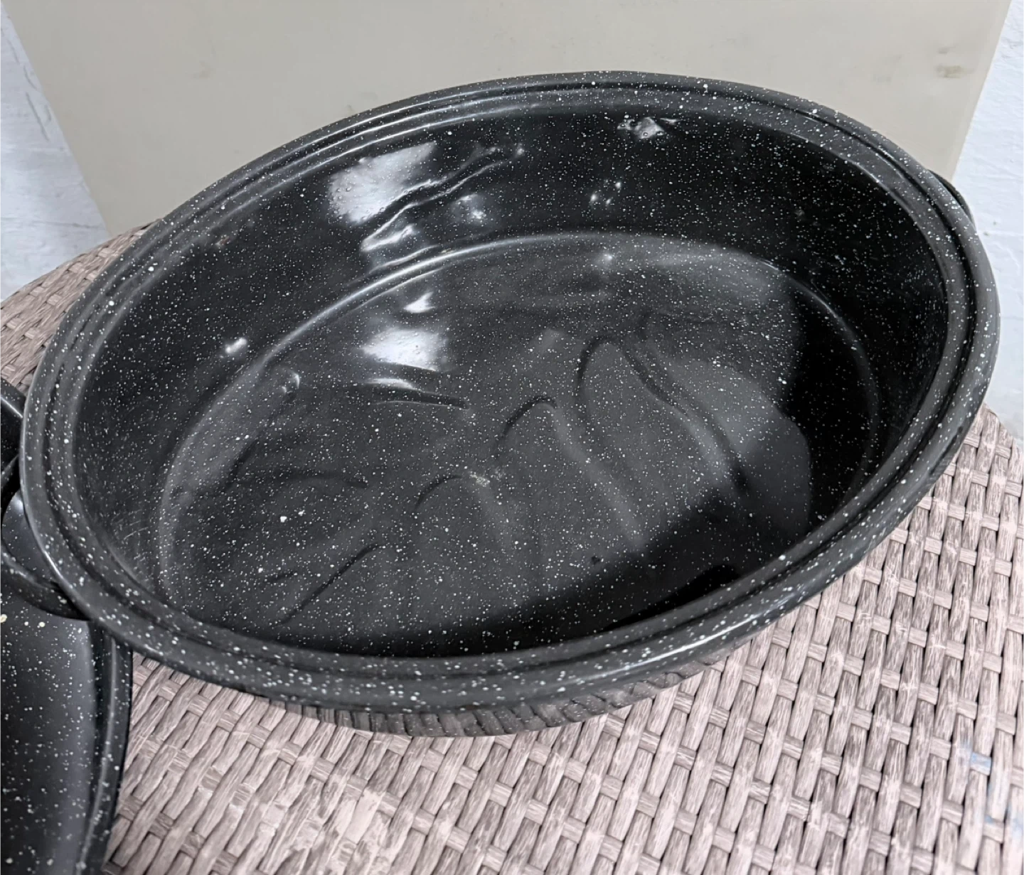 This is a nice Granite Ware roaster with a lid. It's perfect for roasting meats or vegetables in the oven. The speckled black finish gives it a classic look, and it's very durable. It's in great condition and ready for your next family meal