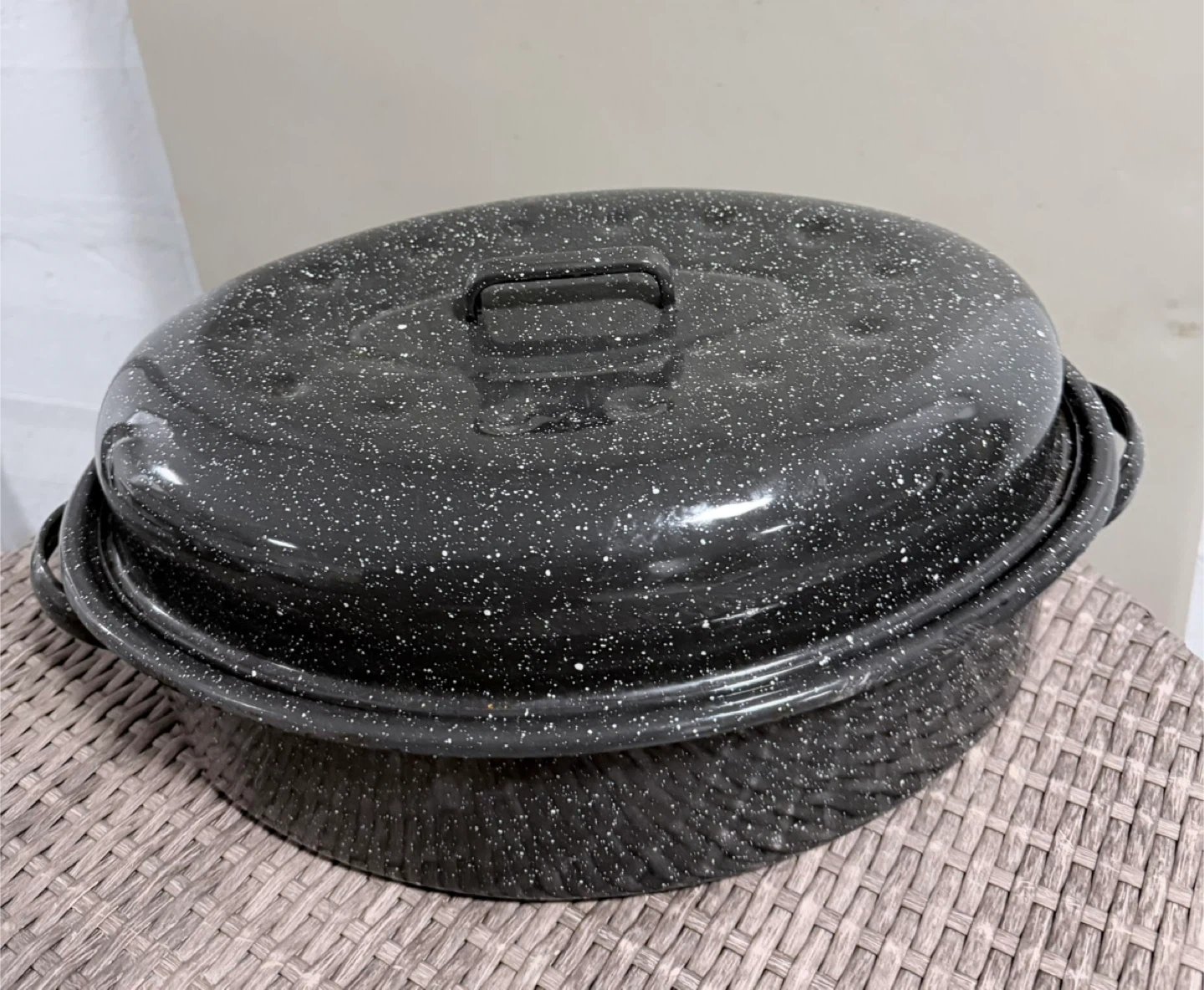 This is a nice Granite Ware roaster with a lid. It's perfect for roasting meats or vegetables in the oven. The speckled black finish gives it a classic look, and it's very durable. It's in great condition and ready for your next family meal