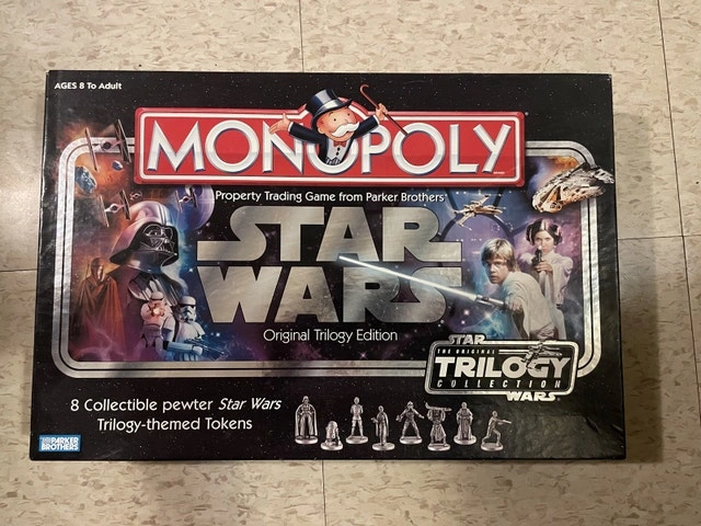 Original Trilogy edition comes with eight pewter game pieces in the shapes of classic Star Wars characters. All New, pieces in sealed shrink wrap. Never played