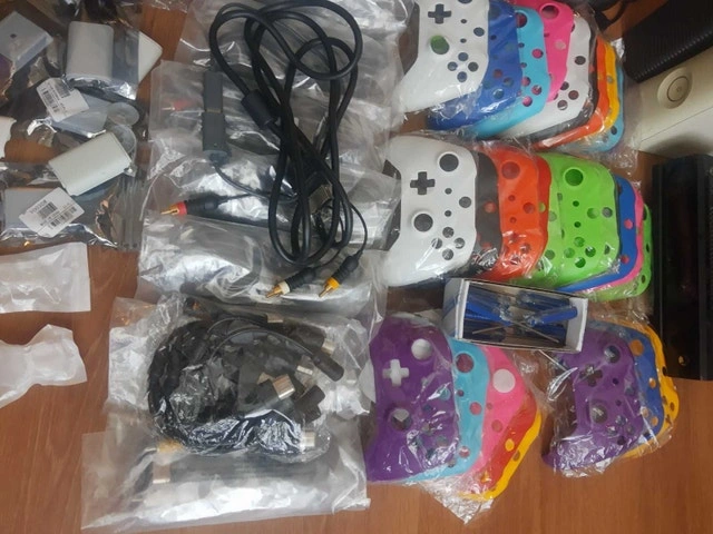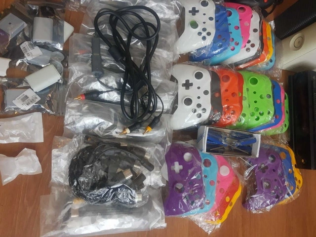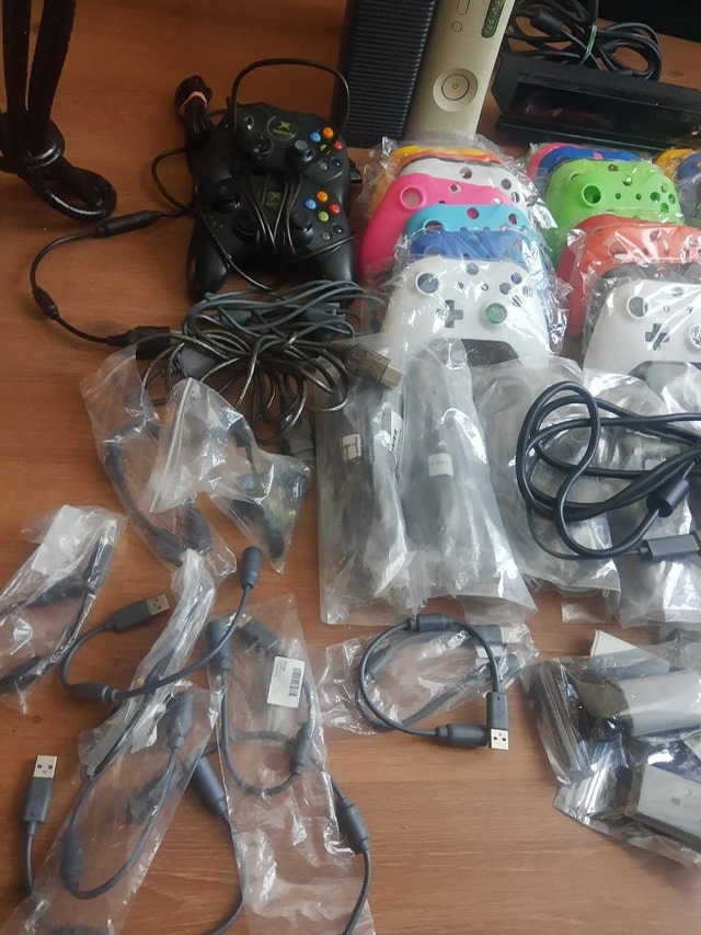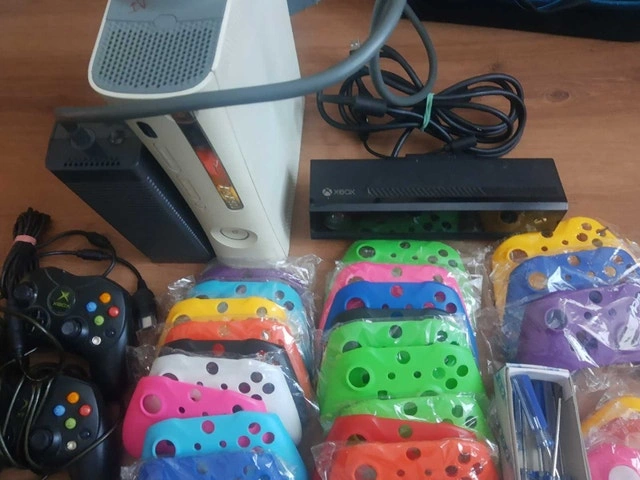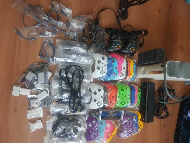 2 og controller s 8 connectors of 8 AV and AC cord sets for og Xbox Xbox one connect About 20 t8 screwdrivers Random controller repair thumb sticks 10 connector plugs for rock band or guitar hero controllers 29 faceplates A few random 360 batter covers A broken 360 arcade console rrod