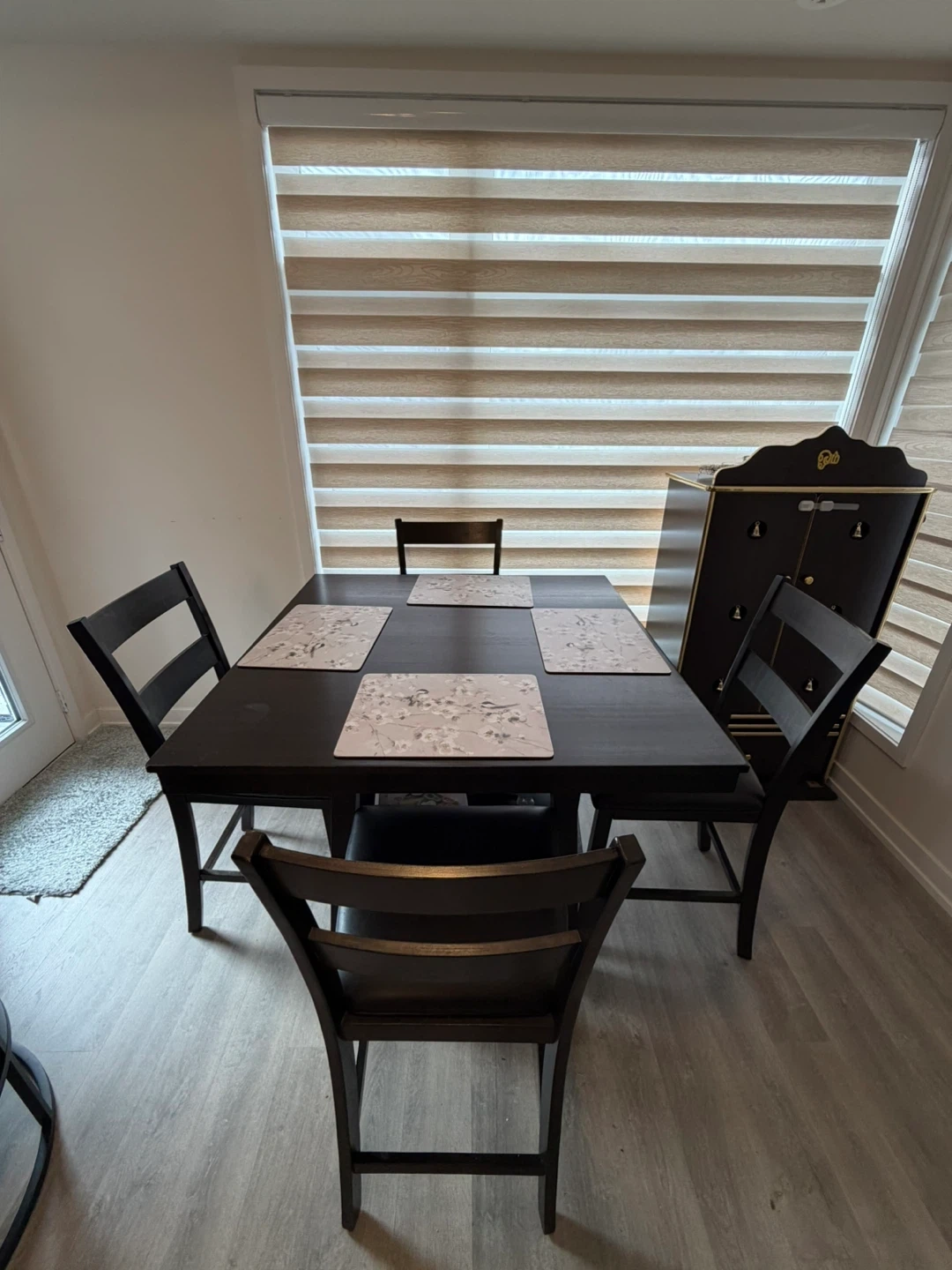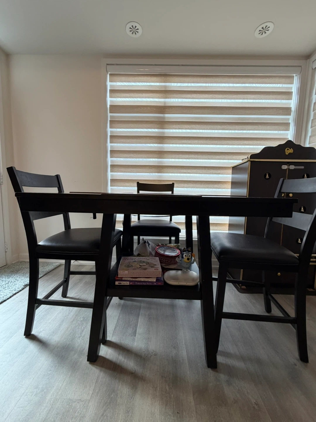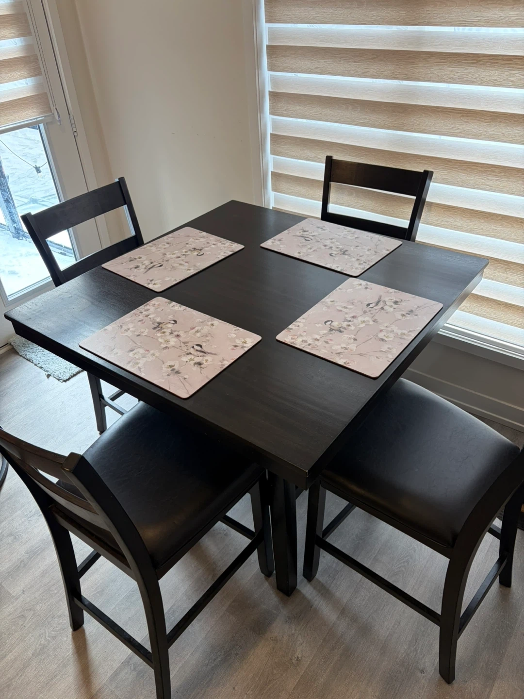 Selling a counter height dining table that comes with four matching chairs. It's a great set for a smaller dining space or kitchen nook. The table also has a convenient shelf underneath for storage or display. The set is in good condition and ready for a new home!