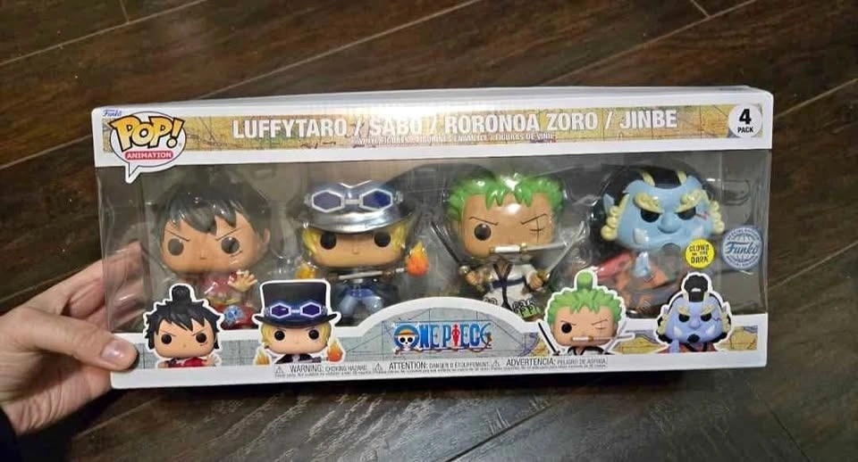 New, sealed Funko Pop! Animation 4-pack featuring Luffy, Sabo, Zoro, and Jinbe. Collectible figures from the popular anime One Piece. Great for collectors or fans.
