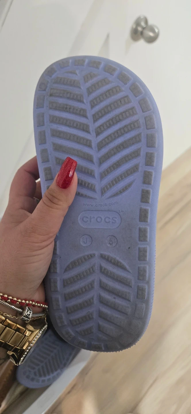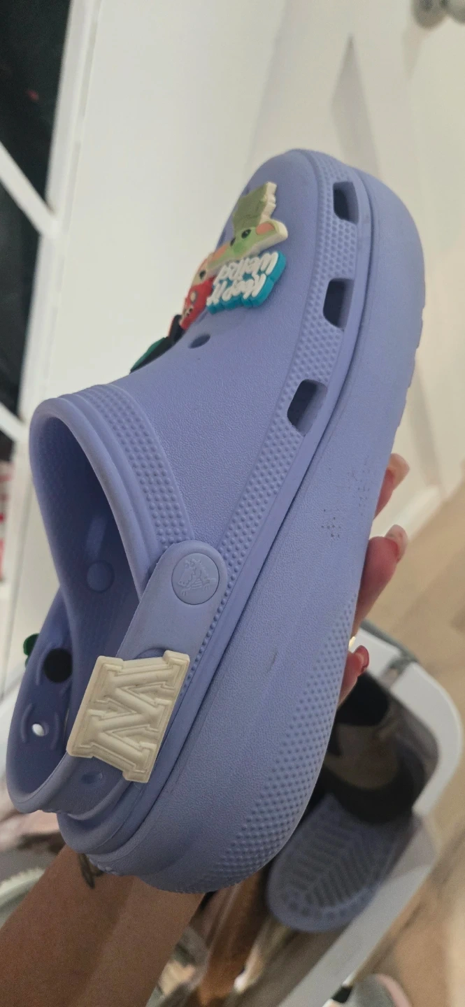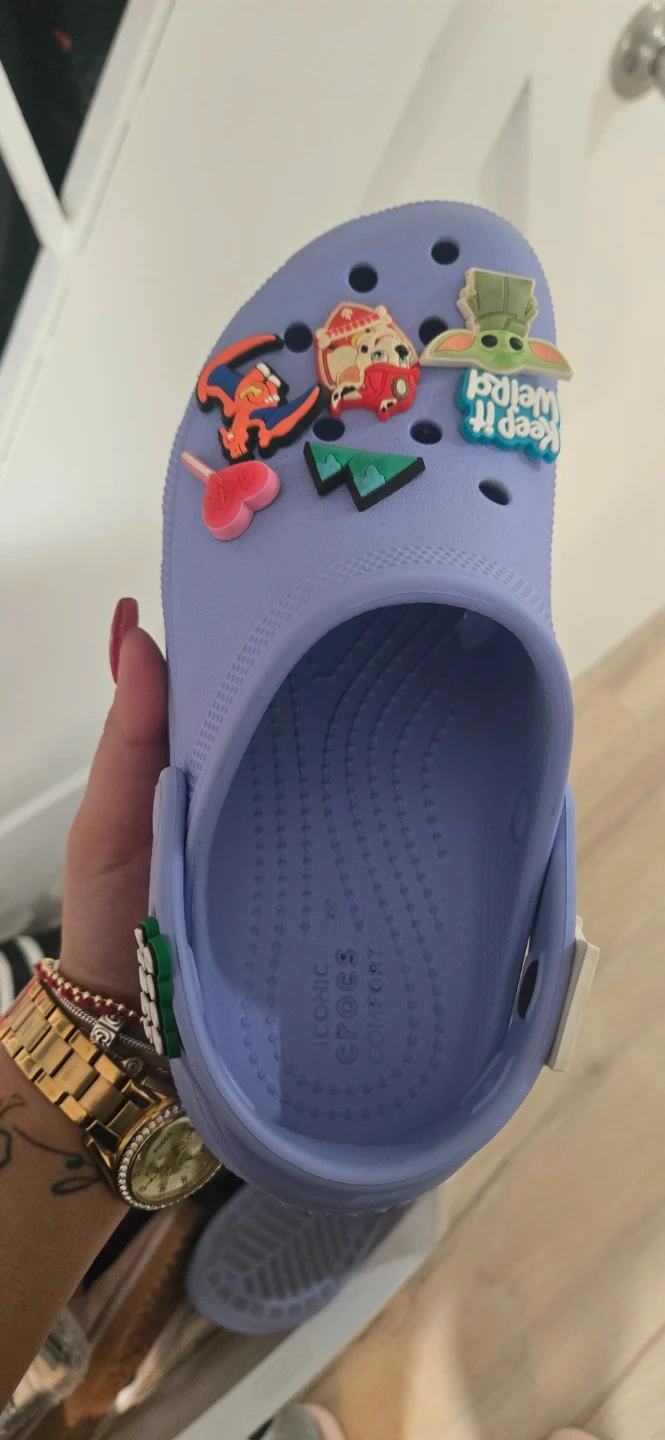 Selling a pair of Crocs Classic clogs in a youth size J5. They are a light purple color and have a few jibbitz attached. Perfect for a kid!