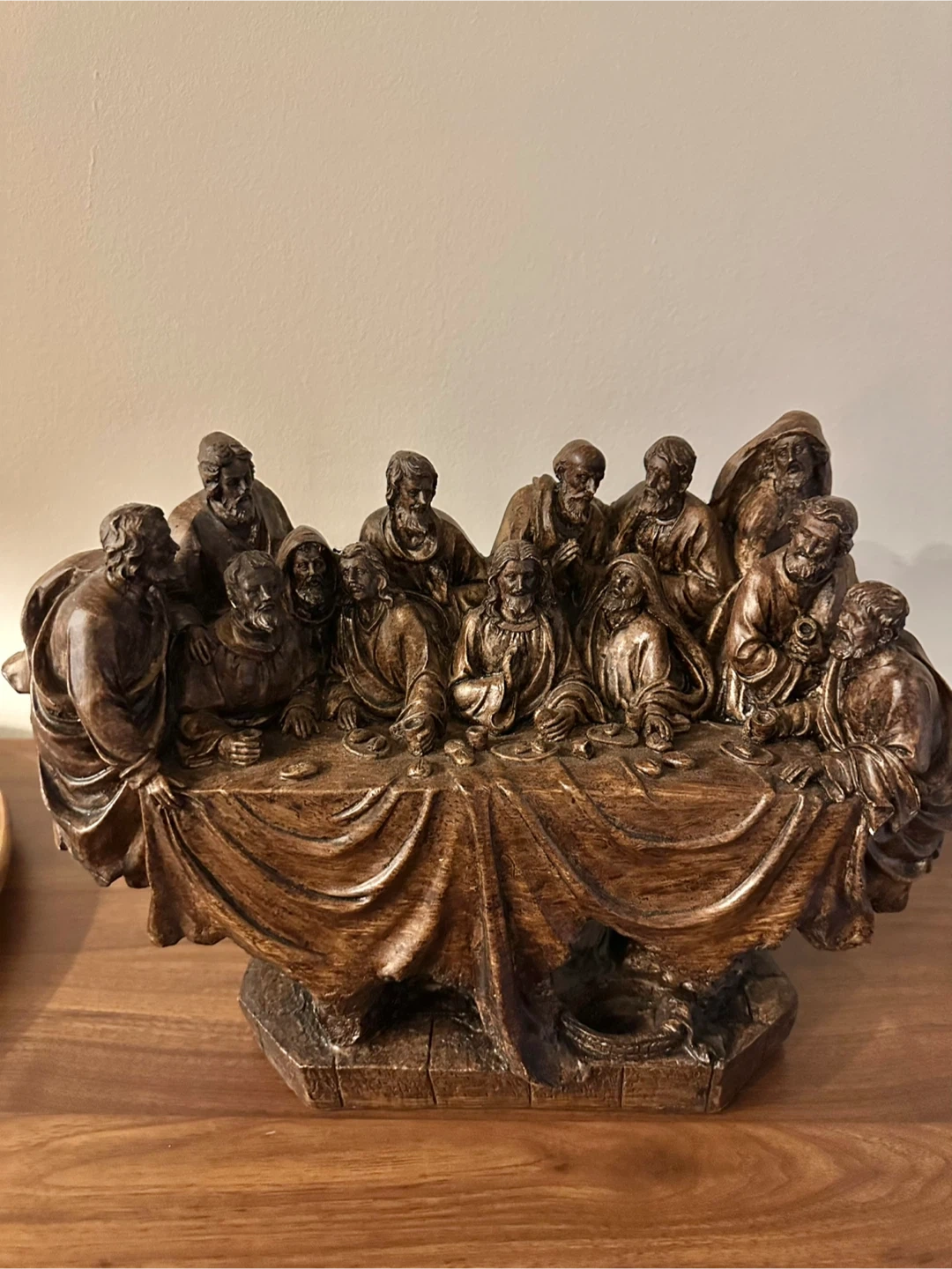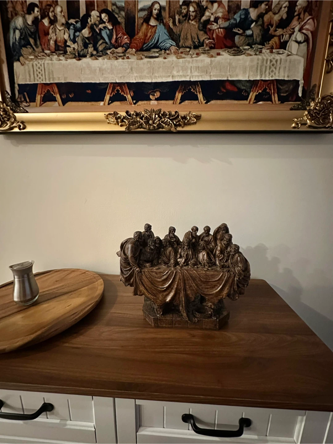 This is a beautiful sculpture of the Last Supper recently purchased from Mexico. It really caught my attention but I don’t know where to place it as we also have the Last supper painting.