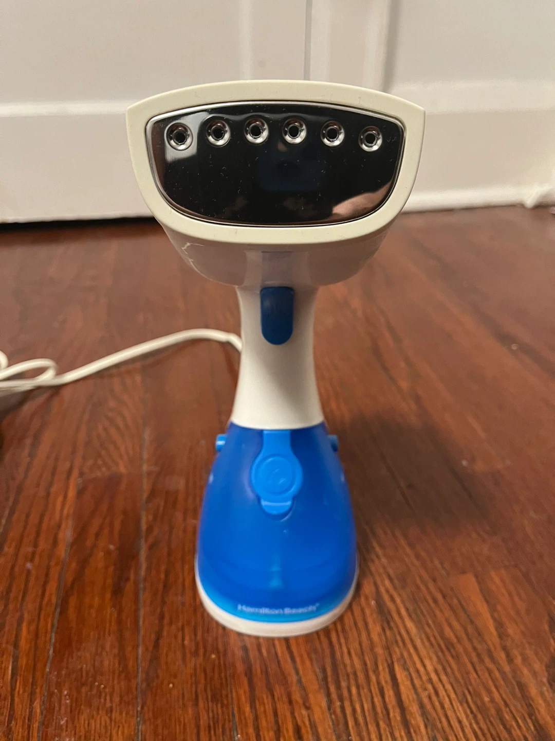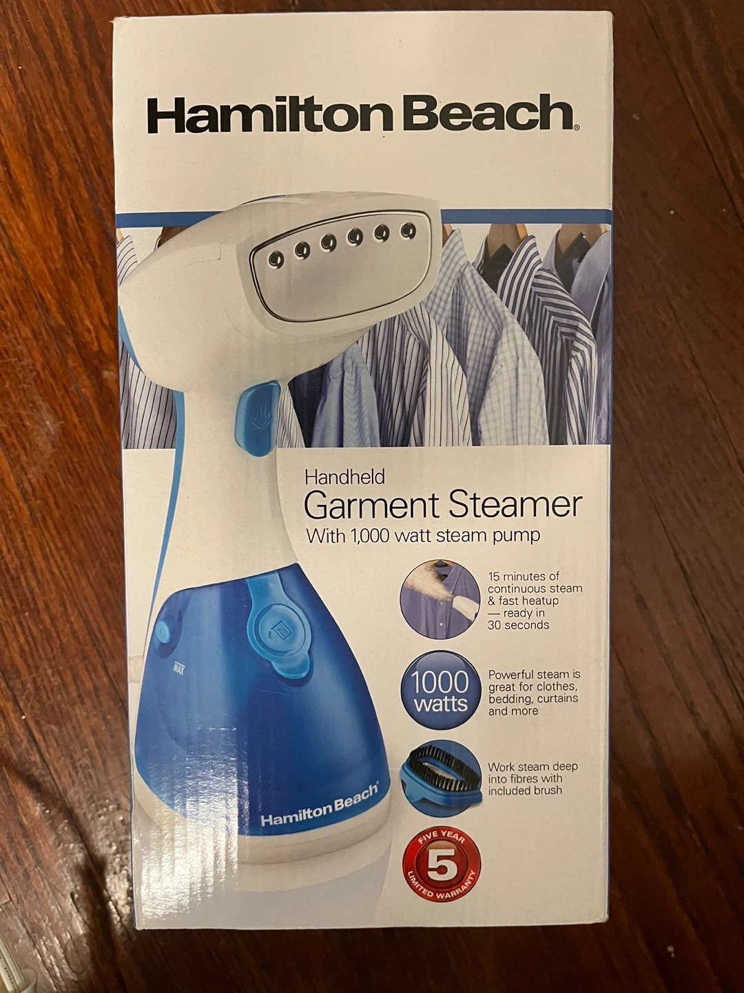 I'm selling a Hamilton Beach handheld garment steamer. This steamer has a 1000 watt steam pump. It's ready for use in just 30 seconds and provides 15 minutes of continuous steam. It's powerful enough for clothes, bedding, curtains, and more! It also comes with a brush to work steam deep into fibres. The box is included