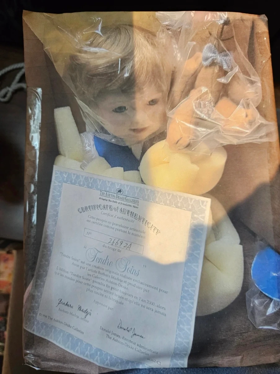 Selling an Ashton-Drake Galleries doll named 'Tendre Soins'. It comes with its Certificate of Authenticity and appears to be in excellent condition inside its packaging. A beautiful addition to any doll collection!