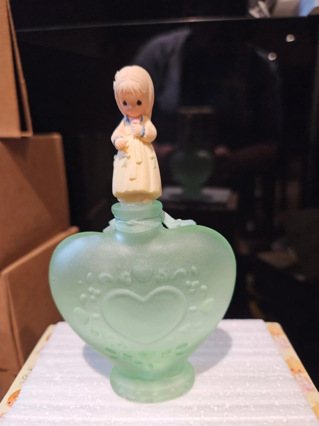 This is a Precious Moments perfume bottle from the Last Forever collection. It's a heart-shaped bottle with a Precious Moments figurine on top. It comes in its original box