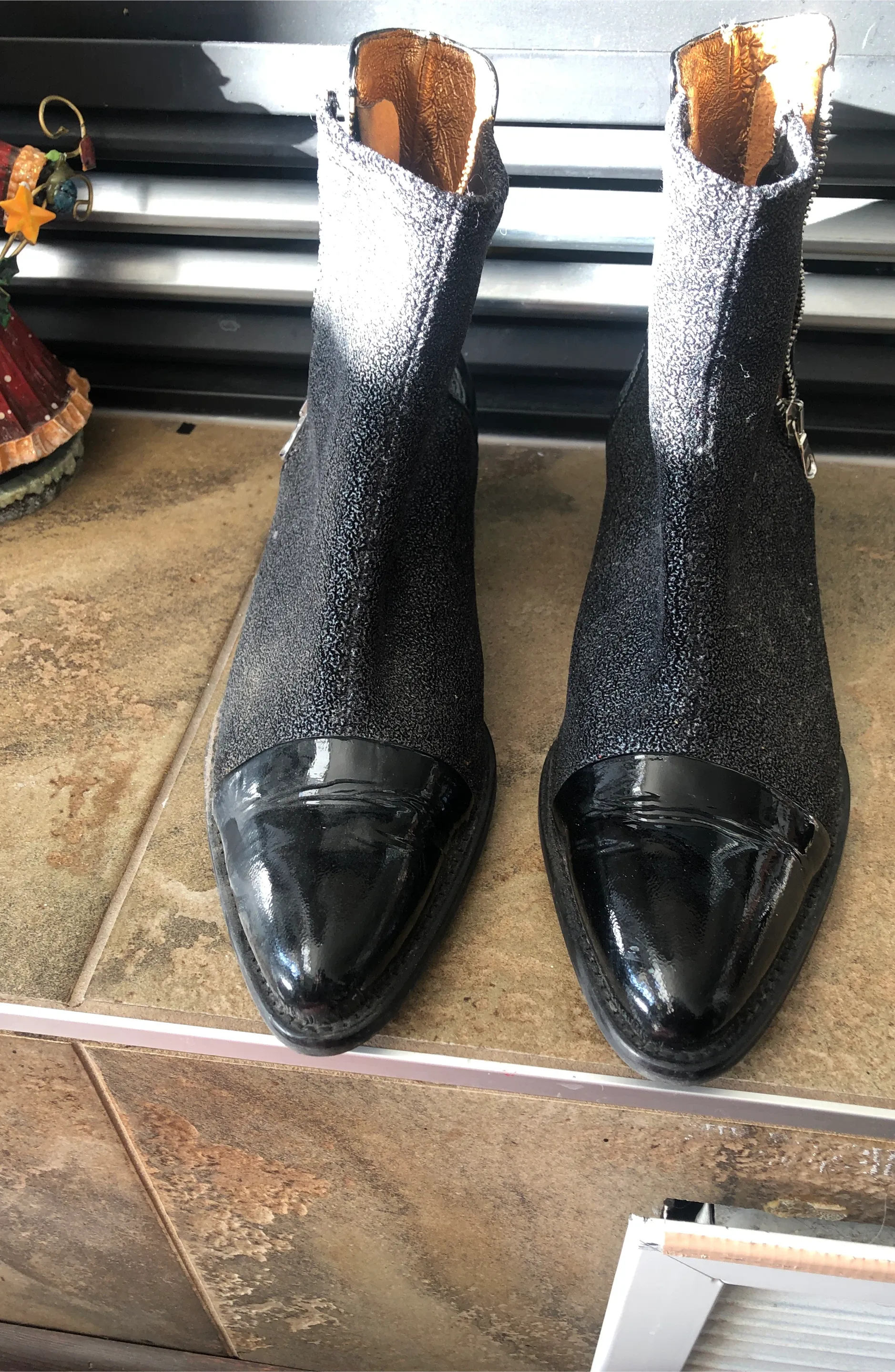 Selling a pair of black ankle boots. They have a unique textured design on the main part of the boot with a shiny, smooth toe cap. They appear to be in good condition, ready for a new owner!