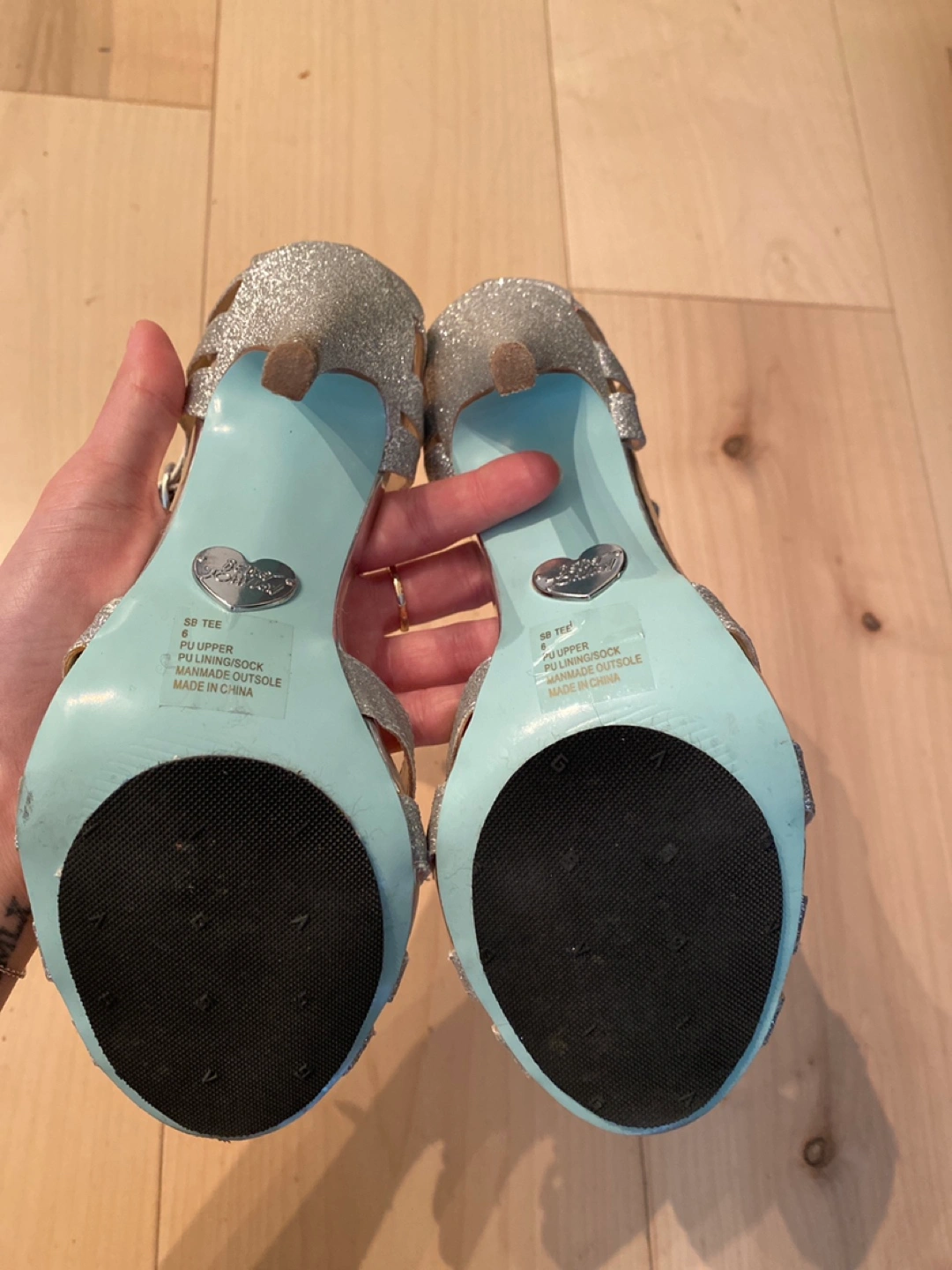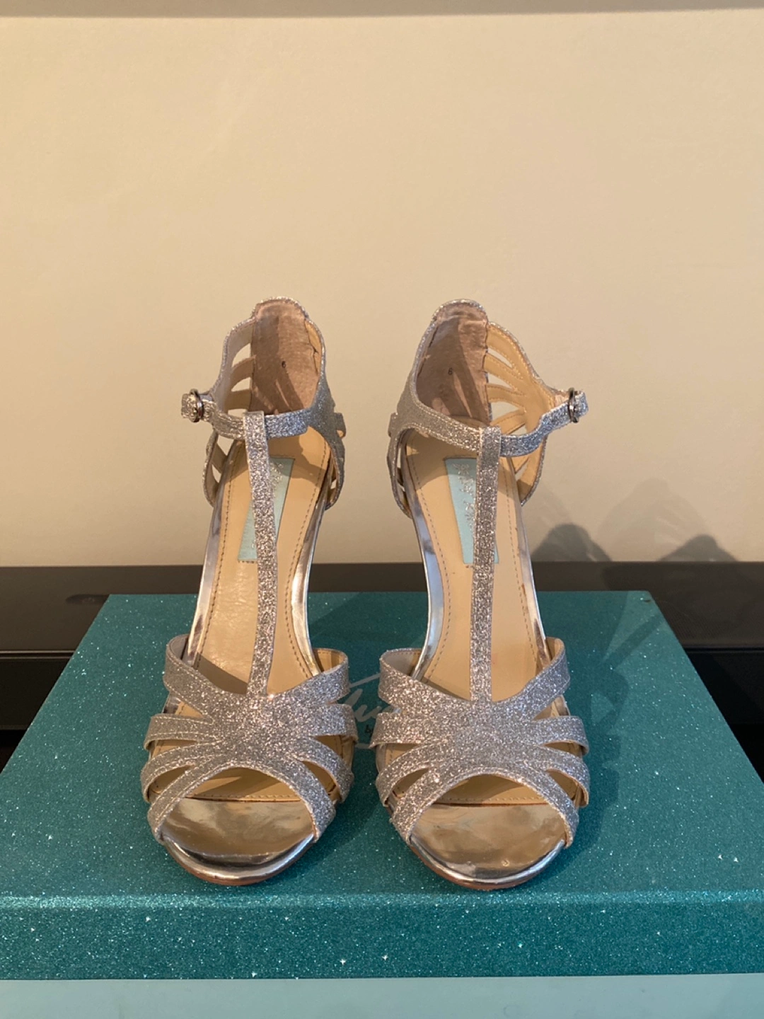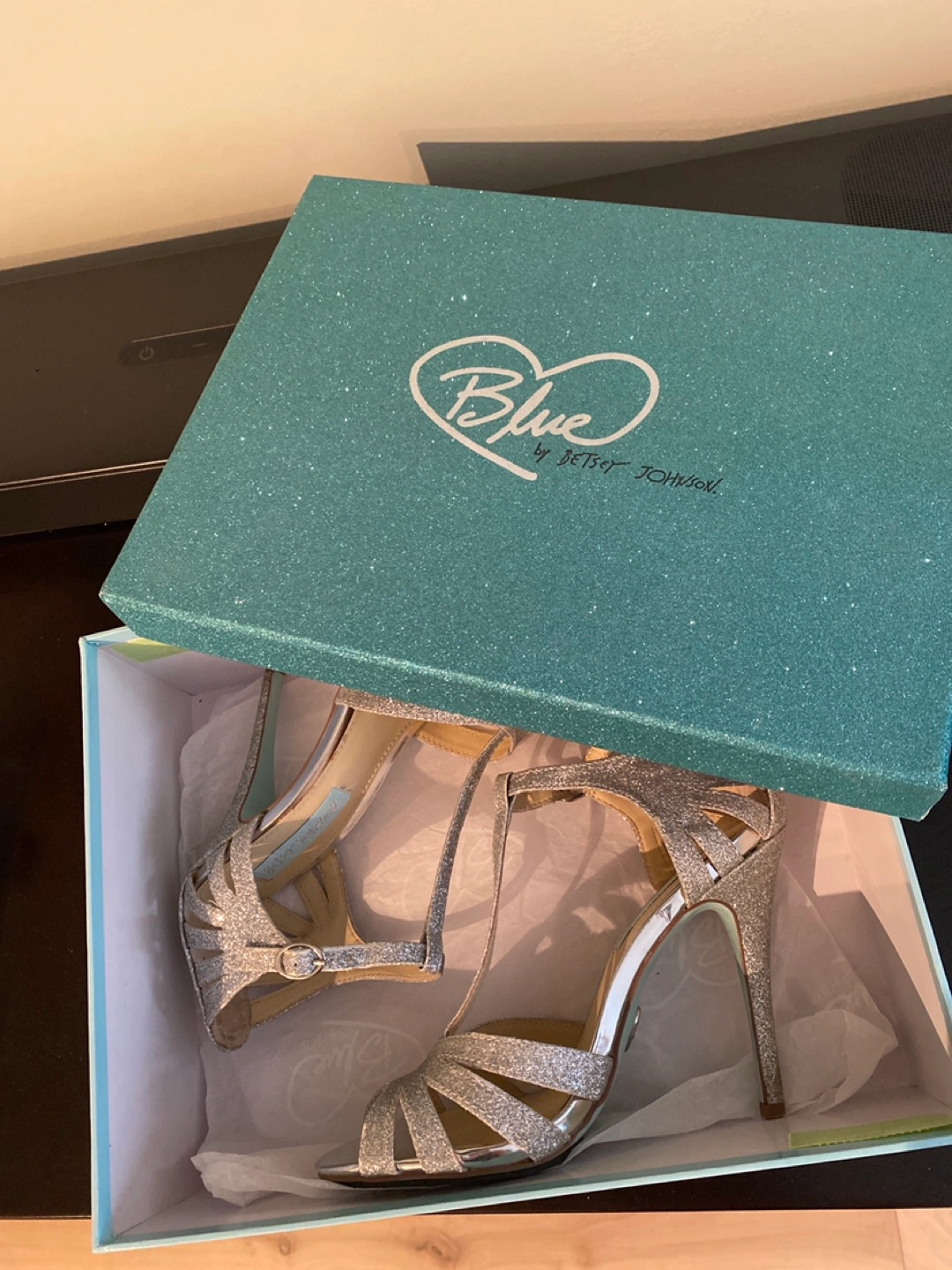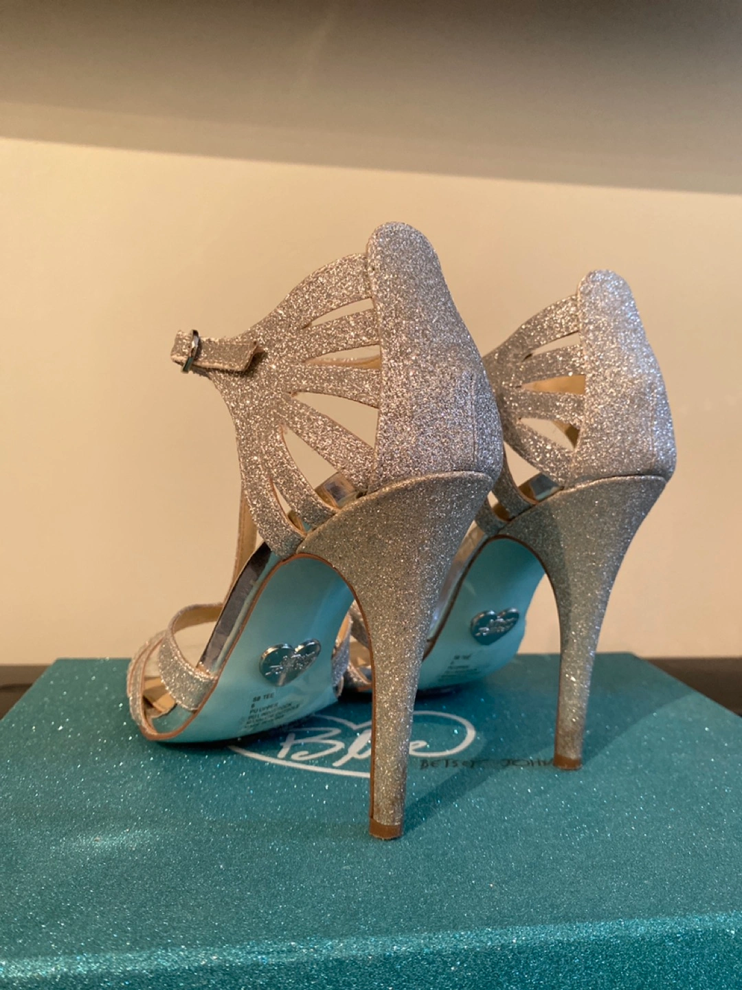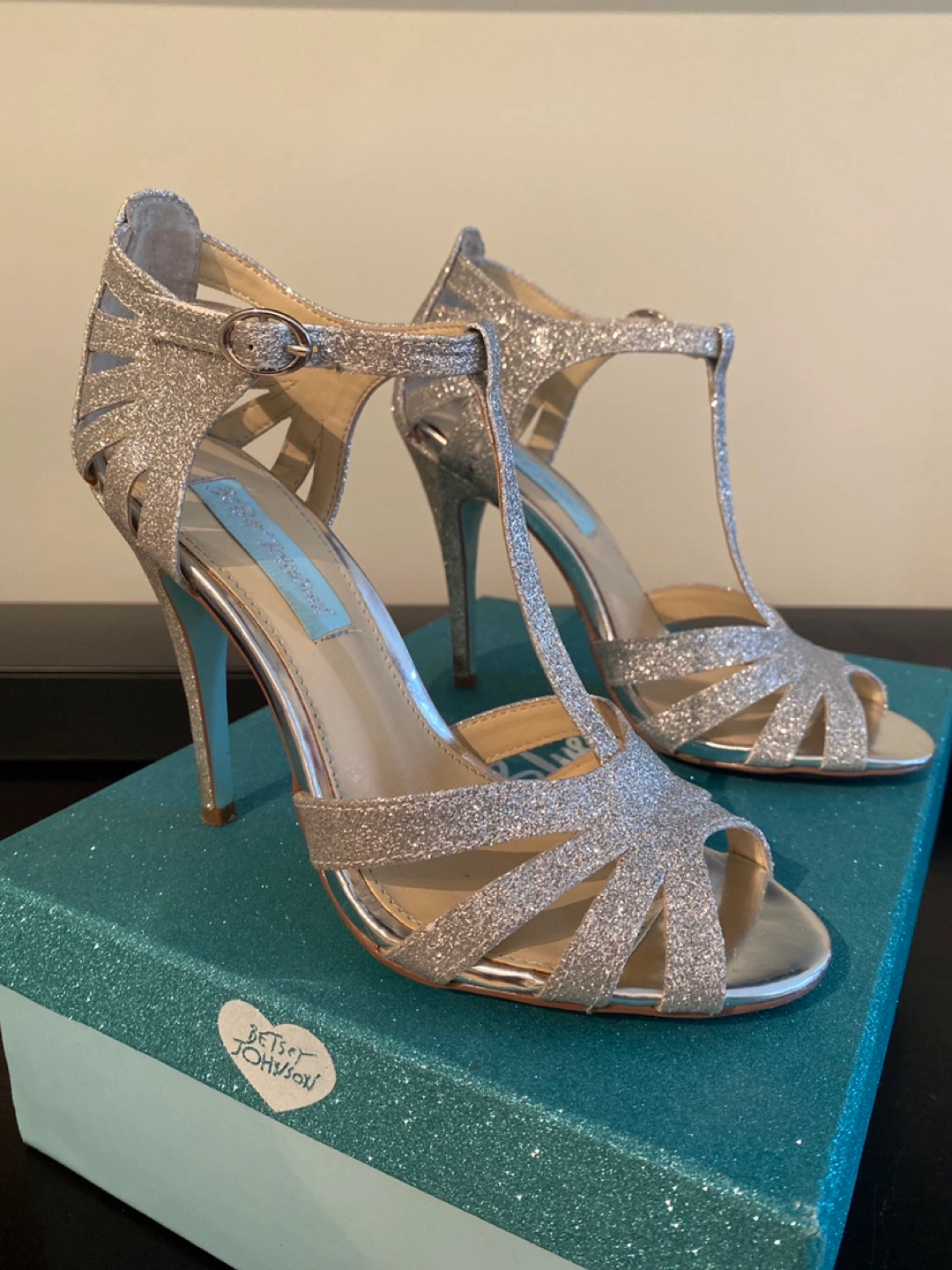 Betsey Johnson strappy silver glitter heels in a women’s size 6. Adjustable ankle straps great for support. Comes with the original box!